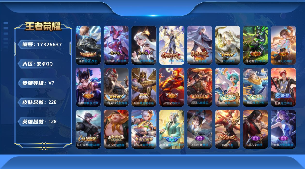 [17326637]安卓Q-V7-最强王者段位-128英雄-228皮肤-1典藏皮肤-2星元-9传说-56史诗