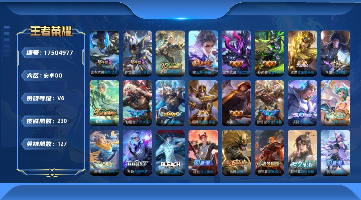[17504977]【特价出售/店主推荐/5152星币/1市标】:安卓Q-V7-最强王者段位-127英雄-230皮肤-2星元-13传说-57史诗
