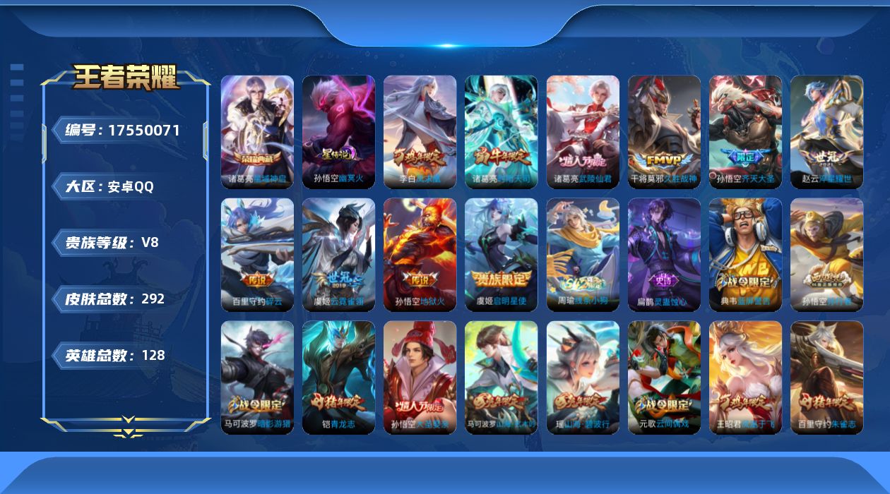 [17550071]【特价急出/详情看图】安卓Q-V8-最强王者段位-128英雄-292皮肤-1典藏皮肤-1星元-10传说-77史诗