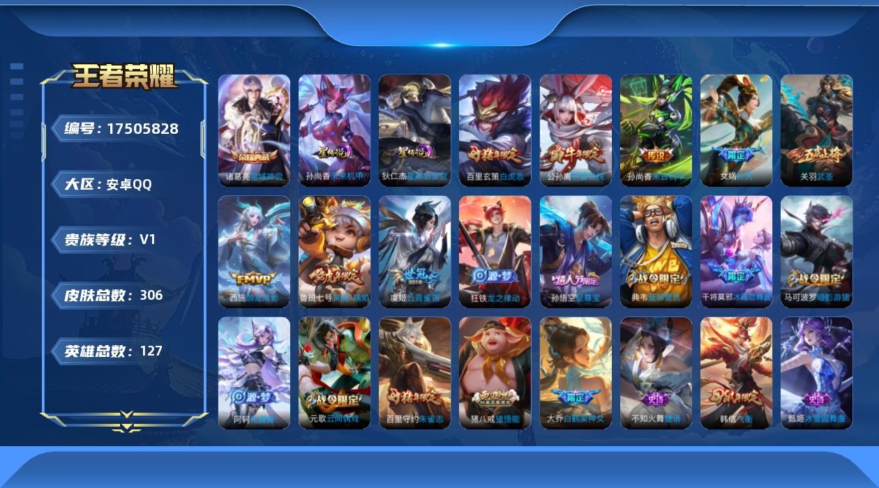 - [11494848]V9 2典藏 23传说 126英雄 295皮肤 典藏英雄武则天 女号 可修改实名 优质装备:星空梦想(太空人),倪克斯神谕(宇宙婆娘),黄金狮子座,绛天战甲(鸡嘴战神),猫影幻舞,一念神魔,云霓雀翎,仲夏夜之梦(大飞蛾),零号·赤焰,海洋之心,李逍遥,时之恋人-刘备(电焊工),淬星耀世,超时空战士-狄仁杰,遇见胡旋,无双飞将 珍宝阁皮:优雅恋人,蔷薇恋人 限定皮:凤求凰(白切鸡),太华(伽罗年限),梅西,异界灵契(白毛香),寅虎·展翼(孙膑年限),白鹤梁神女,白晶晶,时雨天司(水龙头),神威(电光马子),瑞麟志(木兰年限),遇见飞天,高山流水,冰锋战神,天狼运算者,梁祝,御风骁将(吕布年限),天狼狩猎者,逐梦之翼,岱宗(典韦年限),天狼溯光者,奔雷神使(牛魔年限),祈雪灵祝(雪兔子),天狼绘梦者,李小龙,逐梦之影,霸王别姬-虞姬,孙行者,猪悟能,一生所爱,乒乒小将,寅虎·御盾(廉颇年限),寅虎·瑞焰(虎皮蛋子),寅虎·心曲(虎婆),寅虎·赤拳(老虎年限),时之祈愿-云中君,时之祈愿-瑶(瑶传限),匿光启智者 史诗皮:紫霞仙子,苍穹之光,电玩小子(小书包),白龙吟,黄金分割率,特工魅影,千年之狐,冰冠公主,青蛇,偶像歌手,白蛇,晚萤,暗夜猫娘,末日机甲-吕布,猫狗日记-孙策,猫狗日记-大乔,女仆咖啡,水果甜心,天才门将,星夜王子,心灵骇客,功夫厨神,德古拉伯爵,幽灵船长,心灵战警,舞动绿茵,地狱岩魂,诗语江南,纤云弄巧,繁星吟游(呼啦呼啦),缤纷独角兽,逐浪之夏,龙鼓争鸣,箭羽风息,金属风暴,原初追逐者,圣诞恋歌,鹰眼统帅,王者之锤,魅力维加斯,黎明之约,雪上飞焰,赏金猎手,寅虎·御盾,千筹问战,无心