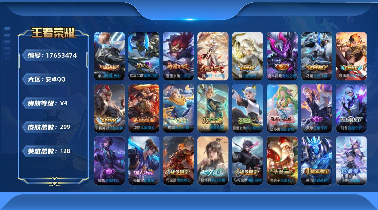 - [15227243]【店主推荐捡漏号!可直接换绑】安卓Q-V6-最强王者段位-126英雄-182皮肤-1典藏皮肤-4传说-63史诗-1星元 【荣耀典藏】:李白鸣剑曳影 【传说皮肤】:后羿神树通天,桑启鸣野蒿,李元芳飞鸢探春,宫本武藏地狱之眼 【限定皮肤】:暃埋骨钱,蒙犽顽岩魄,蔡文姬夏日便利店,大乔绒语心约,虞姬夏日便利店,姜子牙天穹之誓,杨戬破阵退雄兵,李白谪仙醉月,狄仁杰阴阳师,赵云皇家上将,孙尚香蔷薇恋人,孙膑寅虎展翼,扁鹊奇幻香踪,狄仁杰魔术师,项羽海滩派对,杨戬潮玩骑兵,鬼谷子五谷丰年,百里玄策原初追逐者,裴擒虎擒涛扼浪,云中君纤云弄巧,嫦娥如梦令,嫦娥拒霜思,西施玲珑珍味,鲁班大师探海日志,桑启海盐诗旅,戈娅驭风魔法,艾琳流音漫舞,司空震地狱燃心,阿古朵江河有灵,张良古海寻踪,蒙犽百解令,蒙恬荣光圣徽,高渐离燃音魔法,妲己灵卜魔法,鬼谷子天穹祈灯,伽罗琥珀纪元,沈梦溪龙舞盛年,鲁班七号蔬乡物语,李元芳蔬乡物语,刘邦剑破天穹,程咬金群星魔术团,镜青焰无极,项羽苍威无极,刘备异域游侠,周瑜熔金海岸 【年限皮肤】:孙膑寅虎展翼 【赛季限定】:张良古海寻踪,百里玄策原初追逐者,裴擒虎擒涛扼浪,鲁班大师探海日志,桑启海盐诗旅,鬼谷子天穹祈灯,蒙恬荣光圣徽,刘邦剑破天穹,姜子牙天穹之誓 【战令限定】:蔡文姬夏日便利店,虞姬夏日便利店,扁鹊奇幻香踪,艾琳流音漫舞,杨戬潮玩骑兵,西施玲珑珍味,司空震地狱燃心,戈娅驭风魔法,高渐离燃音魔法,妲己灵卜魔法,鲁班七号蔬乡物语,李元芳蔬乡物语,镜青焰无极,项羽苍威无极 【史诗皮肤】:露娜紫霞仙子,赵云皇家上将,赵云未来纪元,甄姬冰雪圆舞曲,王昭君偶像歌手,狄仁杰魔术师,宫本武藏鬼剑武藏,孙尚香蔷薇恋人,孙尚香水果甜心,妲己魅力维加斯,妲己女仆咖啡,墨子金属风暴,曹操幽灵船长,李白千年之狐,吕布末日机甲,张飞乱世虎臣,花木兰水晶猎龙者,刘邦德古拉伯爵,夏侯惇乘风破浪,小乔缤纷独角兽,兰陵王暗隐猎兽者,雅典娜冰冠公主,安琪拉心灵骇客,百里守约特工魅影,铠曙光守护者,刘禅天才门将,李元芳逐浪之夏,阿轲节奏热浪,大乔猫狗日记,狄仁杰鹰眼统帅,娜可露露晚萤,嫦娥如梦令,小乔青蛇,孙尚香时之恋人,百里玄策原初追逐者,云中君纤云弄巧,嫦娥拒霜思,孙膑寅虎展翼,鬼谷子五谷丰年,扁鹊奇幻香踪,刘禅电玩爆裂旋风,戈娅驭风魔法,司空震地狱燃心,阿古朵江河有灵,蒙犽百解