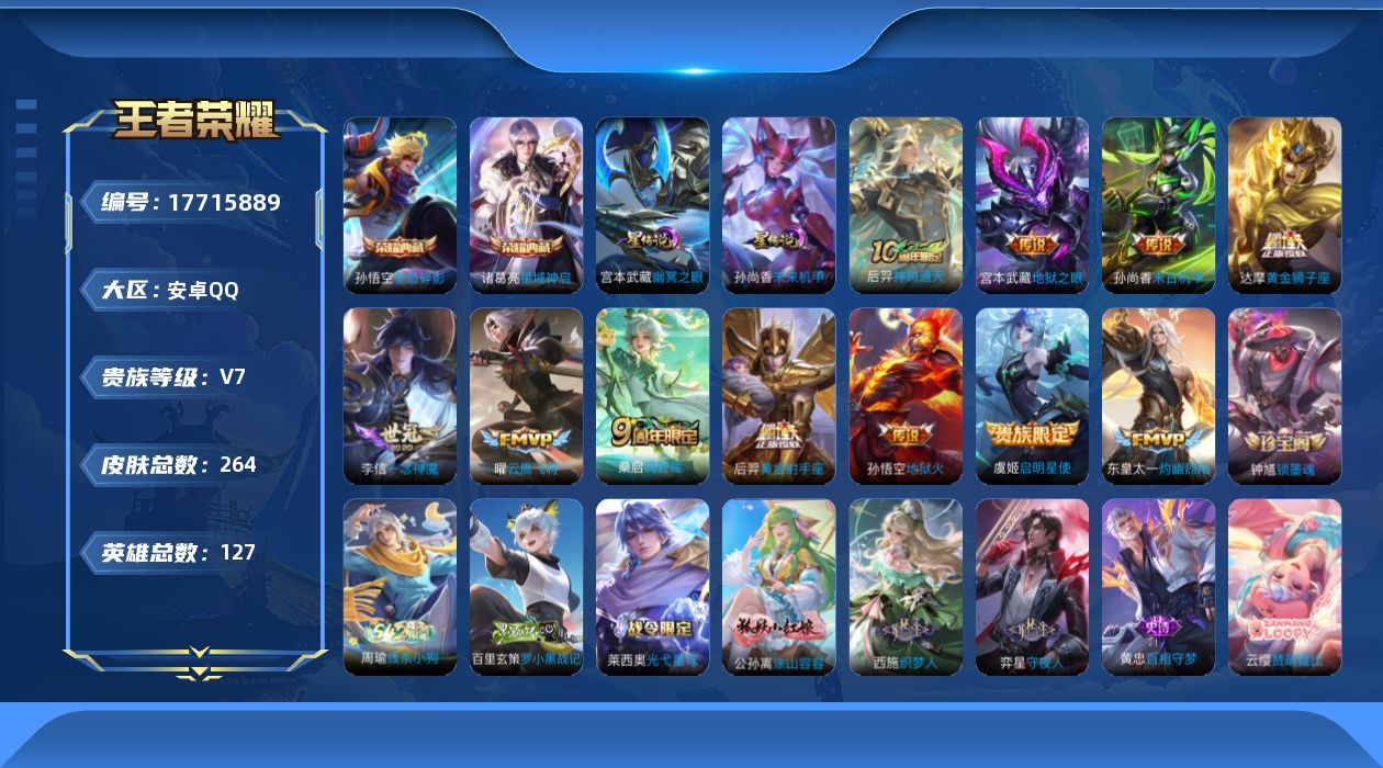[17715889]【特价出售/店主推荐/不包人脸】安卓Q-V7-永恒钻石V段位-127英雄-264皮肤-2典藏皮肤-2星传说-11传说-73史诗