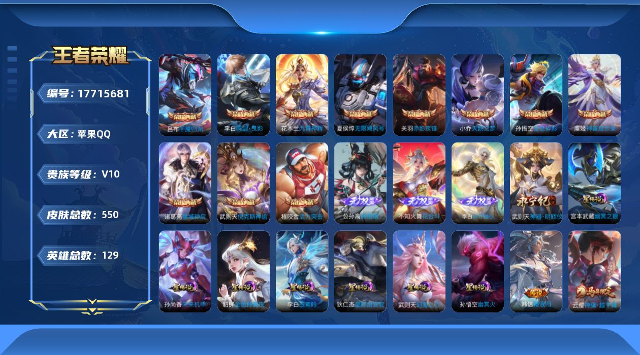 [17715681]可二次【特价出售/店主推荐】:苹果Q-V10-最强王者段位-129英雄-550皮肤-11典藏皮肤-1典藏英雄-4无双-7星元-66传说-7天幕-176史诗