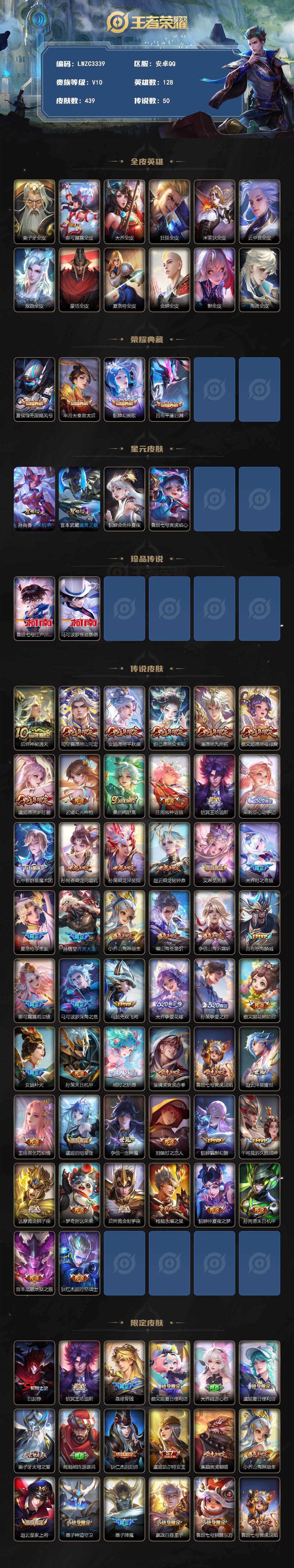[17774483]可二次【特价出售/店主推荐】安卓Q-V10-最强王者段位-128英雄-439皮肤-4典藏皮肤-2珍品传说-4星传说-50传说-130史诗