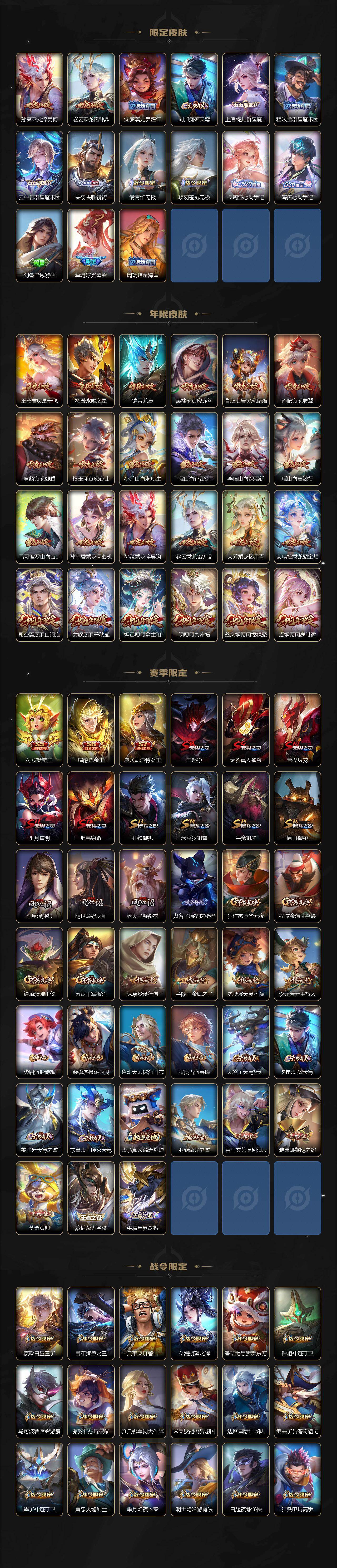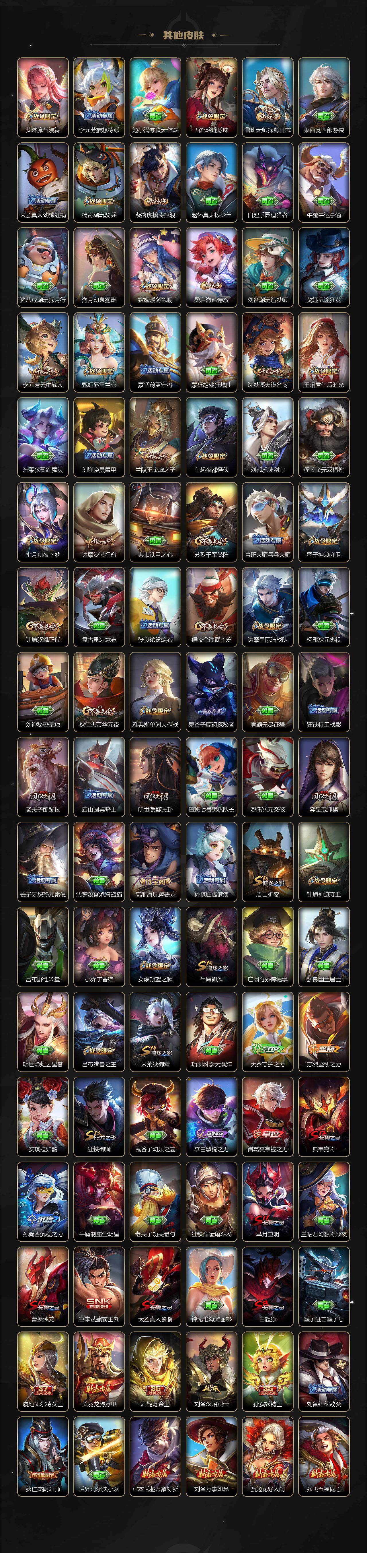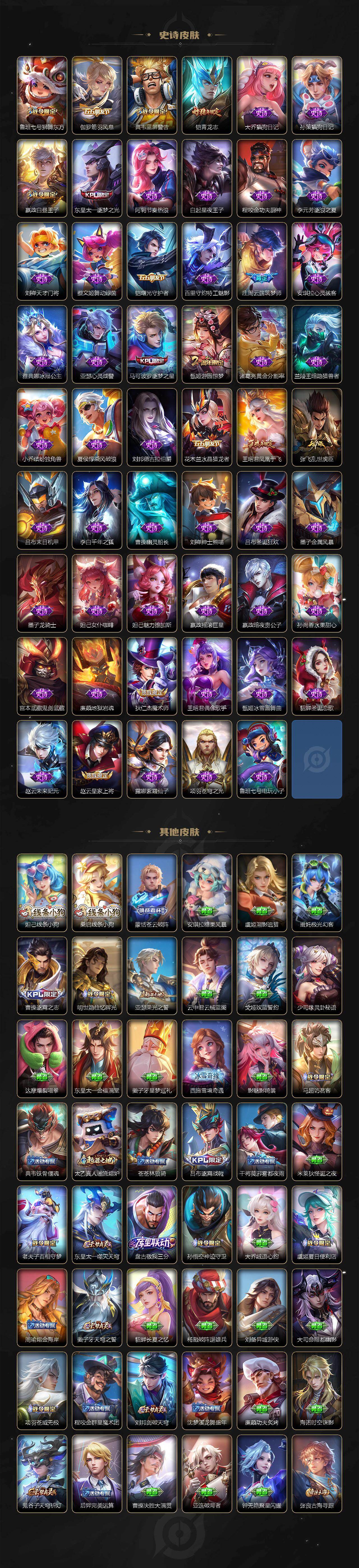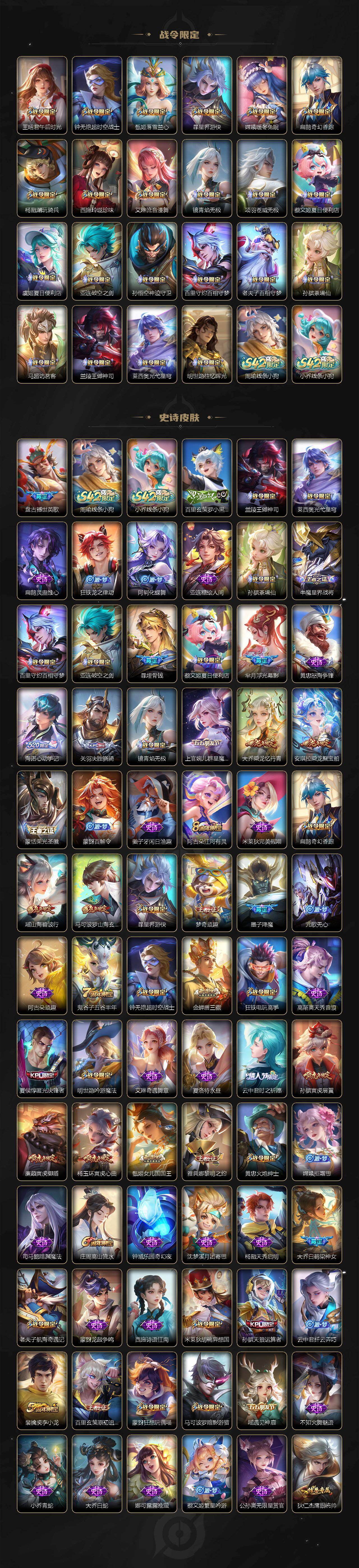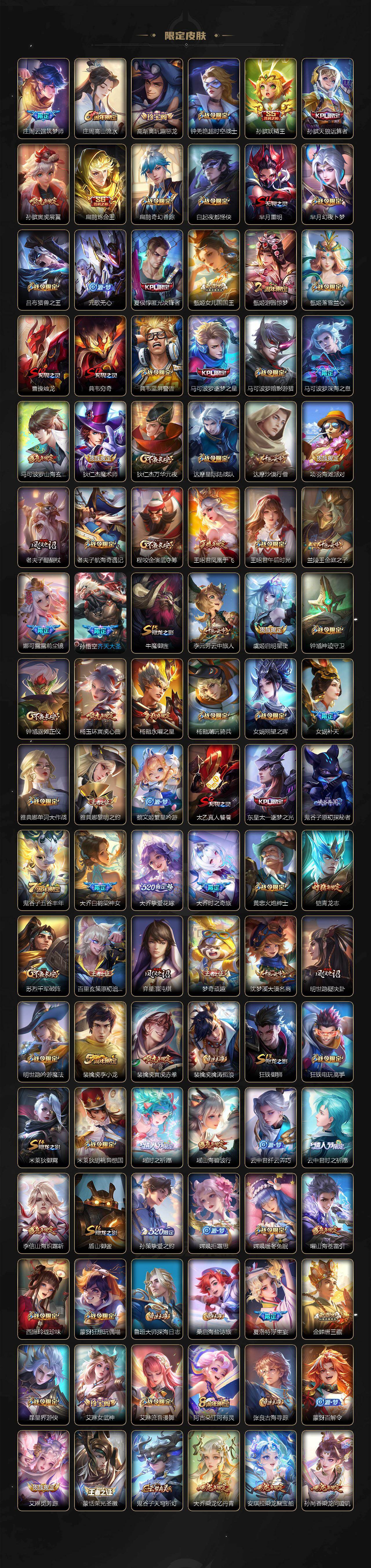 【限定皮肤】:白起狰,铠冥王哈迪斯,暃埋骨钱,蔡文姬夏日便利店,大乔绒语心约,虞姬夏日便利店,姜子牙天穹之誓,杨戬破阵退雄兵,狄仁杰阴阳师,虞姬凯尔特女王,廉颇寅虎御盾,小乔山海琳琅生,赵云皇家上将,墨子神迹守卫,墨子降魔,嬴政白昼王子,鲁班七号狮舞东方,鲁班七号寅虎瑞焰,庄周云端筑梦师,庄周高山流水,高渐离玩趣恶龙,钟无艳超时空战士,孙膑妖精王,孙膑天狼运算者,孙膑寅虎展翼,扁鹊炼金王,扁鹊奇幻香踪,白起夜都怪侠,芈月重明,芈月幻夜卜梦,吕布猎兽之王,元歌无心,夏侯惇匿光决锋者,甄姬女儿国国王,甄姬游园惊梦,甄姬落雪兰心,曹操烛龙,典韦穷奇,典韦蓝屏警告,马可波罗逐梦之星,马可波罗暗影游猎,马可波罗深海之息,马可波罗山海玄木吟,狄仁杰魔术师,狄仁杰万华元夜,达摩星际陆战队,达摩沙漠行僧,项羽海滩派对,老夫子醍醐杖,老夫子航海奇遇记,程咬金演武夺筹,王昭君凤凰于飞,王昭君午后时光,兰陵王金庭之子,娜可露露