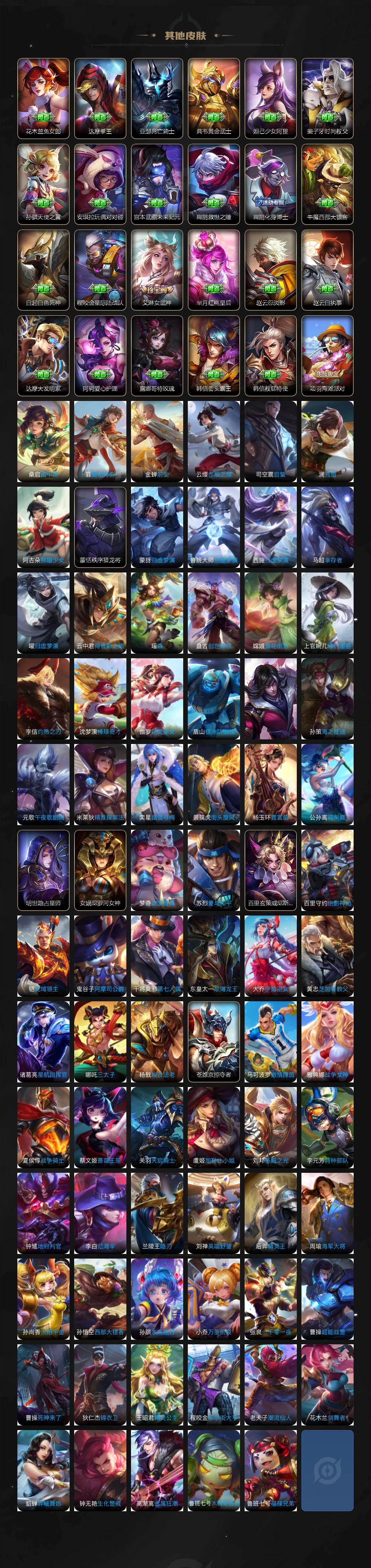 小乔青蛇,大乔白蛇,瑶遇见神鹿,娜可露露晚萤,伽罗箭羽风息,李元芳逐浪之夏,不知火舞魅语,公孙离无限星赏官,大乔猫狗日记,孙策猫狗日记,阿轲节奏热浪,露娜紫霞仙子,诸葛亮黄金分割率,王昭君偶像歌手,项羽苍穹之光,雅典娜冰冠公主,吕布末日机甲,鲁班七号电玩小子,蒙犽龙鼓争鸣,墨子龙骑士,嬴政摇滚巨星,刘禅绅士熊喵,刘禅天才门将,白起星夜王子,安琪拉心灵骇客,程咬金功夫厨神,刘邦德古拉伯爵,兰陵王暗隐猎兽者,曹操幽灵船长,宫本武藏鬼剑武藏,司马懿暗渊魔法,亚瑟心灵战警,钟馗乐园奇幻夜,杨戬天秀·启明,蔡文姬舞动绿茵,廉颇地狱岩魂,西施诗语江南,小乔缤纷独角兽,夏侯惇乘风破浪,花木兰水晶猎龙者,铠曙光守护者,墨子金属风暴,百里玄策原初追逐者,吕布圣诞狂欢,貂蝉圣诞恋歌,百里守约特工魅影,嬴政暗夜贵公子,嫦娥拒霜思,雅典娜黎明之约,李白千年之狐,夏洛特永昼,艾琳奇遇舞章,高渐离天秀·音浪,阿古朵顽趣,姜子牙闲日渔趣,蒙犽百解令,大乔乘龙·忆丹青,安琪拉乘龙·聚宝船,上官婉儿群星魔术团,关羽决胜骁骑,海诺心动手记,亚连糖绘人间