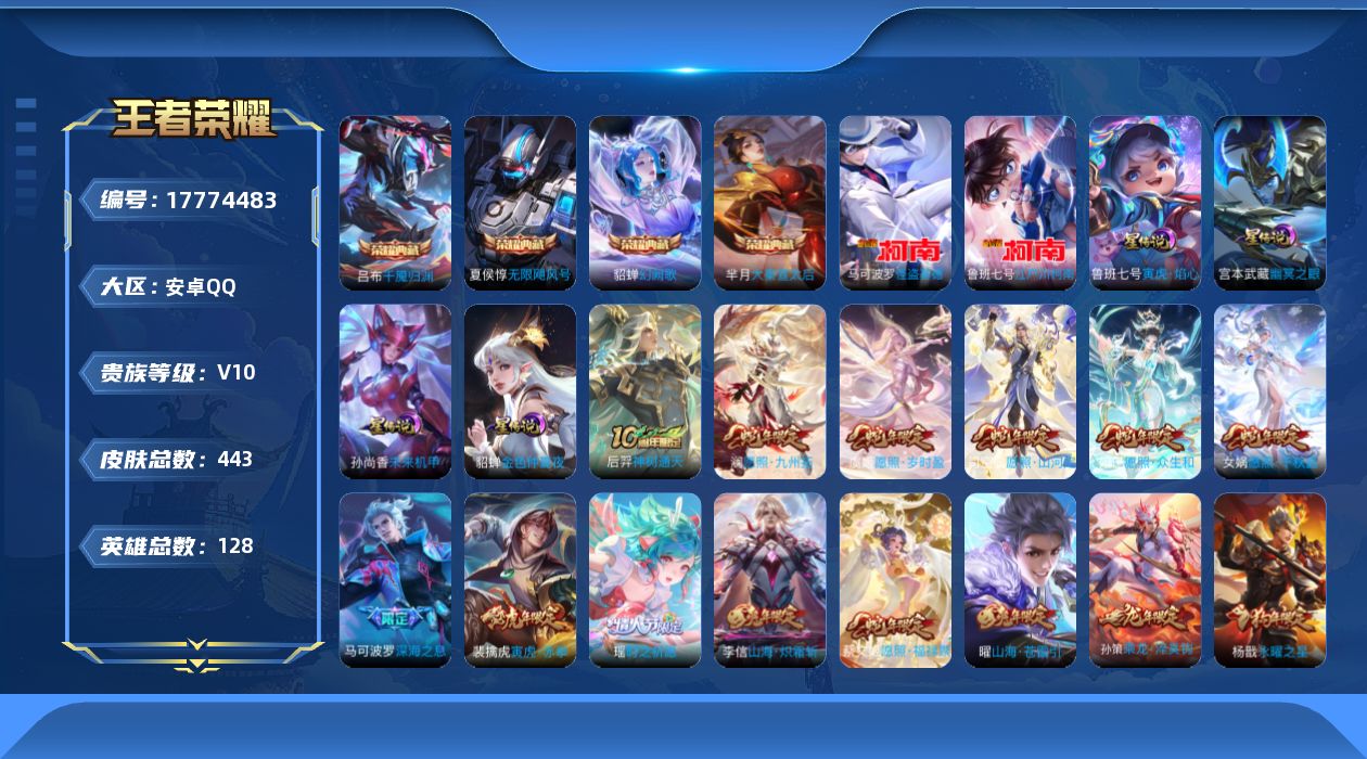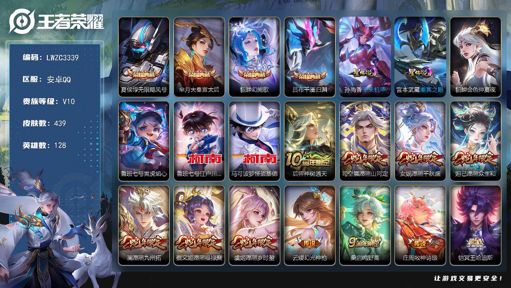 [17774483]可二次【特价出售/店主推荐】安卓Q-V10-最强王者段位-128英雄-439皮肤-4典藏皮肤-2珍品传说-4星传说-50传说-130史诗 【英雄全皮】:姜子牙全皮,娜可露露全皮,大乔全皮,狂铁全皮,米莱狄全皮,云中君全皮,敖隐全皮,蒙恬全皮,夏洛特全皮,金蝉全皮,影全皮,海诺全皮 【荣耀典藏】:夏侯惇无限飓风号,芈月大秦宣太后,貂蝉幻阙歌,吕布千魇归渊 【珍品传说】:鲁班七号江户川柯南,马可波罗怪盗基德 【传说皮肤】:后羿神树通天,司空震愿照山河定,女娲愿照千秋盛,妲己愿照众生和,澜愿照九州拓,蔡文姬愿照福禄聚,虞姬愿照岁时盈,云缨幻光神枪,桑启鸣野蒿,庄周牧神诗旅,铠冥王哈迪斯,朵莉亚心动手记,云中君群星魔术团,孙尚香乘龙问璇玑,孙策乘龙淬吴钩,赵云乘龙铭钟鼎,艾琳觅芳踪,大乔时之奇旅,夏洛特浮生妄,孙悟空齐天大圣,小乔山海琳琅生,曜山海苍雷引,李信山海炽霜斩,吕布怒海麟威,娜可露露前尘镜,马可波罗深海之息,马超无双飞将,大乔挚爱花嫁,孙策挚爱之约,蔡文姬花朝如约,女娲补天,孙策末日机甲,瑶时之祈愿,裴擒虎寅虎赤拳,鲁班七号寅虎瑞焰,赵云淬星耀世,王昭君乞巧织情,虞姬启明星使,李信一念神魔,刘备时之恋人,貂蝉猫影幻舞,干将莫邪久胜战神,达摩黄金狮子座,梦奇胖达荣荣,后羿黄金射手座,杨戬永曜之星,貂蝉仲夏夜之梦,孙尚香末日机甲,宫本武藏地狱之眼,狄仁杰超时空战士 【限定皮肤】:白起狰,铠冥王哈迪斯,暃埋骨钱,蔡文姬夏日便利店,大乔绒语心约,虞姬夏日便利店,姜子牙天穹之誓,杨戬破阵退雄兵,狄仁杰阴阳师,虞姬凯尔特女王,廉颇寅虎御盾,小乔山海琳琅生,赵云皇家上将,墨子神迹守卫,墨子降魔,嬴政白昼王子,鲁班七号狮舞东方,鲁班七号寅虎瑞焰,庄周云端筑梦师,庄周高山流水,高渐离玩趣恶龙,钟无艳超时空战士,孙膑妖精王,孙膑天狼运算者,孙膑寅虎展翼,扁鹊炼金王,扁鹊奇幻香踪,白起夜都怪侠,芈月重明,芈月幻夜卜梦,吕布猎兽之王,元歌无心,夏侯惇匿光决锋者,甄姬女儿国国王,甄姬游园惊梦,甄姬落雪兰心,曹操烛龙,典韦穷奇,典韦蓝屏警告,马可波罗逐梦之星,马可波罗暗影游猎,马可波罗深海之息,马可波罗山海玄木吟,狄仁杰魔术师,狄仁杰万华元夜,达摩星际陆战队,达摩沙漠行僧,项羽海滩派对,老夫子醍醐杖,老夫子航海奇遇记,程咬金演武夺筹,王昭君凤凰于飞,王昭君午后时光,兰陵王金庭之子,娜可露露