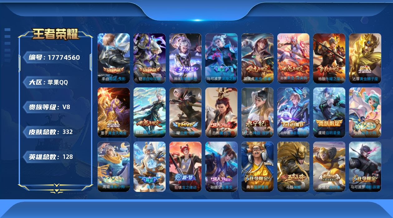 [17774560]【特价出售/店主推荐/3省标/7市标/41段对抗】:苹果Q-V8-至尊星耀I段位-128英雄-332皮肤-2典藏皮肤-1无双-12传说-87史诗