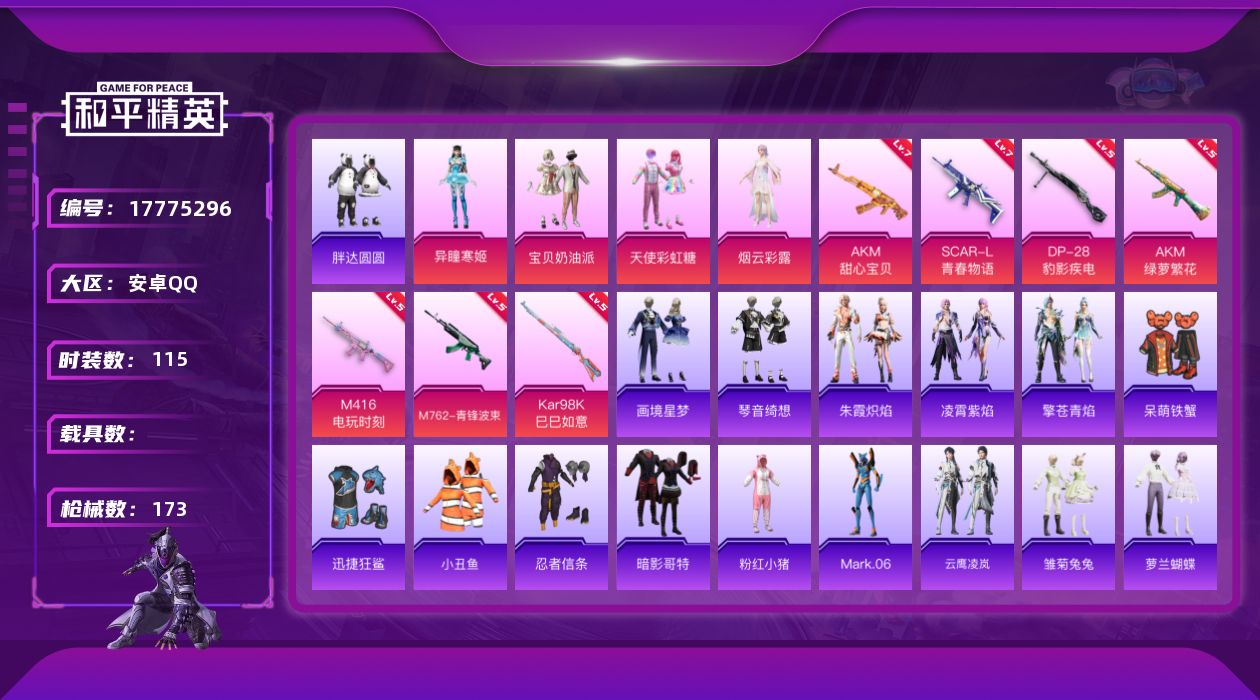 [17775296]安卓 手Q-4粉装-9特效枪-0载具-1粉色飞行器-52112热力值-6王牌印记-115套装-173枪皮 【热门品类】:套装-小丑鱼,套装-胖达圆圆,套装-忍者信条,套装-暗影哥特,套装-粉红小猪,角色-Mark.06 【粉色套装】:粉装-宝贝奶油派,粉装-天使彩虹糖,角色-烟云彩露,角色-异瞳寒姬 【粉色枪皮等级】:AKM-甜心宝贝(七级),AKM-绿萝繁花(五级),SCAR-L-青春物语(七级),M416-电玩时刻(五级),M762-青锋波束(五级),ACE32-萌骑漫游(三级),Kar98K-巳巳如意(五级),Mk14-福马献瑞(五级),DP-28-豹影疾电(五级) 【粉色枪皮】:AKM-甜心宝贝,AKM-绿萝繁花,SCAR-L-青春物语,M416-电玩时刻,M762-青锋波束,ACE32-萌骑漫游,Kar98K-巳巳如意,Mk14-福马献瑞,DP-28-豹影疾电 【粉色飞行器】:星之彼岸飞行器 【粉色降落伞】:甜心宝贝降落伞,星之彼岸降落伞,青春物语降落伞,百合蜜语降落伞,莲影清波降落伞,熔岩统帅降落伞,江南烟雨降落伞,初号机 觉醒Ver.降落伞,忍者神龟降落伞,荧海星豚降落伞,炫彩糖果降落伞 【稀有套装】:套装-云鹰凌岚,套装-雏菊兔兔,套装-萝兰蝴蝶,套装-小熊娃娃,套装-白辉玉蕊,套装-云朵鹅,套装-雪绒豹,角色-夜瞳黯灵,套装-朱霞炽焰,套装-凌霄紫焰,套装-擎苍青焰,套装-画境星梦,套装-琴音绮想,套装-雨过天青,套装-红釉青花 【稀有枪皮】:AKM-影袭,AKM-星之彼岸,AKM-江南烟雨,AKM-龙的传人,M16A4-幻世战舞者,M16A4-莲影清波,SCAR-L-夜灯,M416-糯团青竹,M416-蓝色火焰,GROZA-林间仙鹿,AUG-天降萌叽,AUG-耀粉歌者,QBZ-飞驰魅影,M762-甜心宝贝,M762-云朵鹅,AC-VAL-快闪甜心,蜜獾-天降萌叽,蜜獾-绯穹魔姬,ACE32-画境星梦,ARX-凌霄紫焰,UZI-啾咪啾咪,UZI-天降萌叽,UZI-影袭,UZI-炫彩节奏,UMP45-夜灯,UMP45-生命誓言,Vector-焰鹰斗篷,Vector-彩虹符号,Vector-生命誓言,汤姆逊-天降萌叽,汤姆逊-幻影战神,汤姆逊-像素花束,MP5K-画境星梦,JS9-凌霄紫焰,P90-快闪甜心,P90-飞驰魅影,P90-巳巳如意,Kar