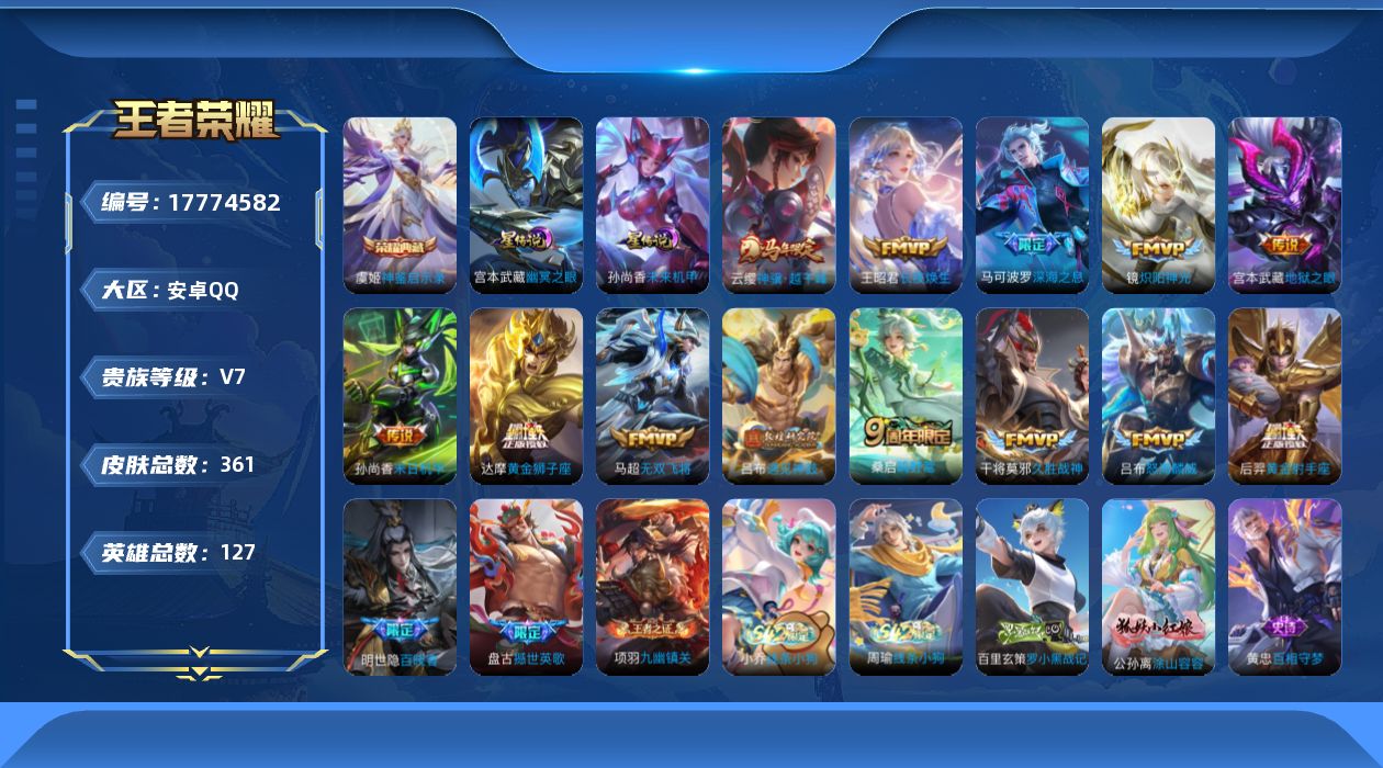 - [15782748]背包多一颗水晶安卓WX-V11-最强王者段位-128英雄-613皮肤-1典藏皮肤-1典藏英雄-6无双-1珍品传说-87传说-219史诗 【英雄全皮】:墨子全皮,刘禅全皮,阿轲全皮,钟无艳全皮,扁鹊全皮,白起全皮,元歌全皮,典韦全皮,李白全皮,达摩全皮,司马懿全皮,姜子牙全皮,刘邦全皮,孙权全皮,朵莉亚全皮,娜可露露全皮,刘备全皮,李元芳全皮,钟馗全皮,杨戬全皮,哪吒全皮,鬼谷子全皮,黄忠全皮,苏烈全皮,弈星全皮,梦奇全皮,沈梦溪全皮,明世隐全皮,狂铁全皮,米莱狄全皮,云中君全皮,李信全皮,盾山全皮,猪八戒全皮,亚连全皮,大司命全皮,蒙犽全皮,鲁班大师全皮,蒙恬全皮,阿古朵全皮,桑启全皮,夏洛特全皮,司空震全皮,云缨全皮,金蝉全皮,赵怀真全皮,戈娅全皮,空空儿全皮,影全皮,海诺全皮,少司缘全皮 【荣耀典藏】:武则天英雄,李白鸣剑曳影 【无双皮肤】:武则天神器明辉仪,李白碎月剑心,韩信群星魔术团,公孙离离恨烟,诸葛亮天机白泽,铠神罪 【珍品传说】:马可波罗怪盗基德 【传说皮肤】:杨戬纵目迁山,后羿神树通天,曹操万灵伏威,干将莫邪千山共赴,元歌诡秘之主,大司命死亡执政官,司马懿九山相柳,西施续相思,司空震愿照山河定,女娲愿照千秋盛,妲己愿照众生和,澜愿照九州拓,蔡文姬愿照福禄聚,虞姬愿照岁时盈,云缨幻光神枪,裴擒虎祥瑞亨通,嬴政玄雷天君,王昭君映山客,桑启鸣野蒿,庄周牧神诗旅,夏侯惇霜北刀,铠冥王哈迪斯,朵莉亚心动手记,云中君群星魔术团,墨子黄金天蝎座,亚连落雪白狼,典韦战鼓燎原,孙尚香乘龙问璇玑,孙策乘龙淬吴钩,赵云乘龙铭钟鼎,铠琥珀纪元,澜逐花归海,艾琳觅芳踪,狄仁杰夜礼服假面,王昭君永恒水手月亮,甄姬至美化雀舞,吕布遇见神鼓,宫本武藏惊梅引,云缨鹤归松栖,马可波罗妄想实况,东皇太一灼幽烈阳,诸葛亮鹤羽星尊,张飞百相守梦,夏洛特浮生妄,干将莫邪画中仙,伽罗炽翼辉光,孙悟空齐天大圣,小乔山海琳琅生,李信山海炽霜斩,吕布怒海麟威,李白诗剑行,娜可露露前尘镜,马可波罗深海之息,马超无双飞将,大乔挚爱花嫁,孙策挚爱之约,女娲补天,孙策末日机甲,鲁班七号寅虎瑞焰,赵云淬星耀世,王昭君乞巧织情,曜李逍遥 ,李元芳飞鸢探春,兰陵王默契交锋,诸葛亮时雨天司,铠绛天战甲,镜炽阳神光,虞姬启明星使,孙悟空零号赤焰,曜云鹰飞将,李信一念神魔,刘备时之恋人,伽罗太华,张良黄金白羊座,干将莫