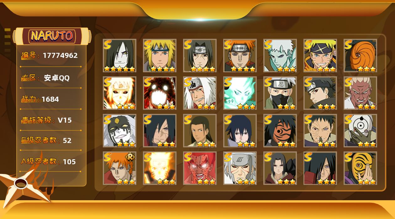 [17774962]52S级忍者数-105A级忍者数 【S级忍者】:长门「秽土转生」(3星),半藏「秽土转生」(3星),金角·银角「秽土转生」(3星),猿飞日斩「秽土转生」(3星),波风水门「秽土转生」(3星),千手扉间「秽土转生」(3星),千手柱间「秽土转生」(3星),宇智波鼬「秽土转生」(3星),宇智波斑「秽土转生」(3星),宇智波斑「秽土转生·解」(3星),大野木「忍界大战」(3星),春野樱「忍界大战」(3星),宇智波带土「忍界大战」(3星),艾「忍界大战」(3星),宇智波鼬「须佐能乎」(4星),宇智波止水「须佐能乎」(3星),旗木卡卡西「须佐能乎」(3星),宇智波斑「木叶创立」(3星),千手柱间「木叶创立」(3星),无「二代目土影」(3星),艾「四代目雷影」(3星),罗砂「四代目风影」(3星),鬼灯幻月「二代目水影」(3星),艾「三代目雷影」(3星),自来也(3星),自来也「舞之豪杰」(3星),大蛇丸(5星),自来也「传说中的三忍」(3星),纲手(3星),纲手「百豪」(3星),千手柱间(3星),千手扉间(3星),猿飞日斩(3星),宇智波斑(3星),波风水门(4星),药师兜「仙人模式」(3星),神秘面具男(3星),神秘面具男「红夜之刃」(3星),漩涡鸣人「九喇嘛连结」(3星),迈特凯「死门」(3星),佩恩「天道」(4星),佩恩·天道「超」(3星),宇智波佐助「永恒万花筒」(3星),宇智波斑 「白面具」(3星宇智波斑「白面具」),大筒木金式(3星),大筒木桃式(3星),大筒木舍人「最终章」(3星),漩涡鸣人「暴怒·第六尾」(3星),波风水门「九喇嘛连结」(3星),宇智波斑「五影会谈」(3星),漩涡鸣人·宇智波佐助(3星),宇智波带土「十尾人柱力」(3星) 【A级忍者】:艾「青年」(2星),三船「青年」(2星),三船(2星),长门「青年」(2星),波风水门「青年」(3星),波风水门「新春限定」(2星),达鲁伊「博人传」(2星),达鲁伊(2星),迪达拉(2星),迪达拉「新春限定」(2星),迪达拉「秽土转生」(2星),大蛇丸「晓」(2星),大蛇丸「新春限定」(2星),奇拉比(2星),奇拉比「忍界大战」(2星),飞段(5星),飞段「死司凭血」(5星),飞段「恶灵之影」(2星),干柿鬼鲛(5星),干柿鬼鲛「鲛肌融合」(2星),漩涡博人「桃式显现」(2星),漩涡鸣人「仙人模式」(3星),漩涡