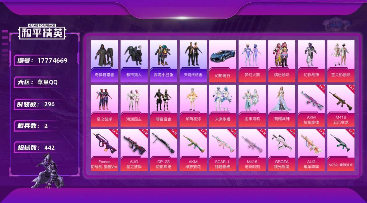 [17774669]苹果 手Q-11粉装-22特效枪-2载具-10粉色飞行器-143799热力值-21王牌印记-296套装-442枪皮