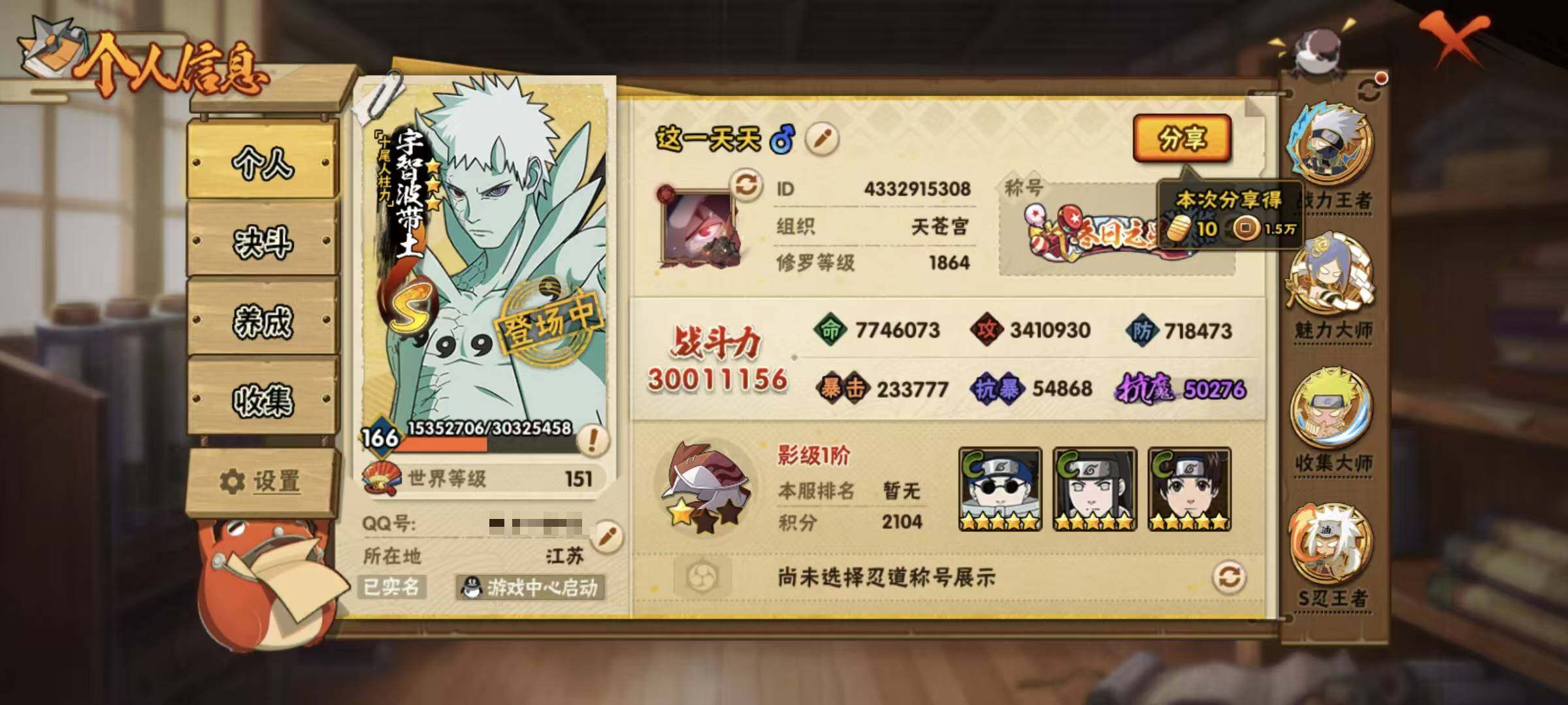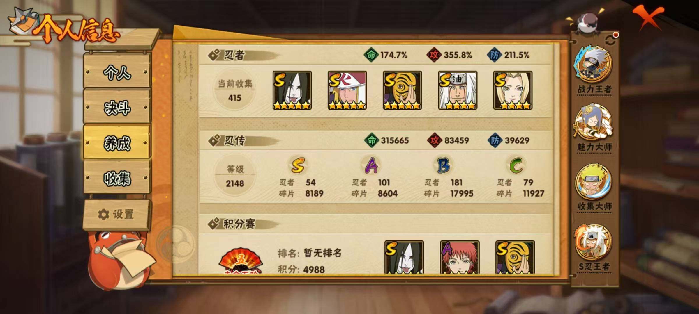 [17774759]54S级忍者数-100A级忍者数 【S级忍者】:长门「秽土转生」(3星),半藏「秽土转生」(3星),金角·银角「秽土转生」(3星),猿飞日斩「秽土转生」(3星),波风水门「秽土转生」(3星),千手扉间「秽土转生」(3星),千手柱间「秽土转生」(3星),宇智波鼬「秽土转生」(3星),宇智波斑「秽土转生」(3星),宇智波斑「秽土转生·解」(3星),大野木「忍界大战」(3星),春野樱「忍界大战」(3星),宇智波带土「忍界大战」(3星),艾「忍界大战」(3星),宇智波鼬「须佐能乎」(4星),宇智波止水「须佐能乎」(3星),旗木卡卡西「须佐能乎」(3星),宇智波斑「木叶创立」(3星),千手柱间「木叶创立」(3星),无「二代目土影」(3星),艾「四代目雷影」(3星),罗砂「四代目风影」(3星),鬼灯幻月「二代目水影」(3星),大野木「三代目土影」(3星),艾「三代目雷影」(4星),自来也(4星),自来也「仙人模式」(3星),自来也「舞之豪杰」(3星),大蛇丸(5星),自来也「传说中的三忍」(3星),纲手(4星),纲手「百豪」(3星),千手柱间(3星),千手扉间(4星),猿飞日斩(4星),宇智波斑(3星),波风水门(5星),药师兜「仙人模式」(3星),神秘面具男(5星),神秘面具男「红夜之刃」(3星),漩涡鸣人「九喇嘛连结」(3星),迈特凯「死门」(4星),佩恩「天道」(4星),佩恩·天道「超」(3星),宇智波佐助「永恒万花筒」(3星),宇智波斑 「白面具」(4星宇智波斑「白面具」),大筒木金式(3星),大筒木桃式(3星),大筒木舍人「最终章」(3星),漩涡鸣人「暴怒·第六尾」(3星),波风水门「九喇嘛连结」(3星),宇智波斑「五影会谈」(3星),漩涡鸣人·宇智波佐助(3星),宇智波带土「十尾人柱力」(3星) 【A级忍者】:艾「青年」(3星),三船「青年」(2星),三船(2星),长门「青年」(2星),波风水门「青年」(3星),波风水门「新春限定」(2星),达鲁伊「博人传」(2星),迪达拉(3星),迪达拉「新春限定」(2星),迪达拉「秽土转生」(2星),大蛇丸「晓」(2星),大蛇丸「新春限定」(2星),奇拉比(2星),奇拉比「忍界大战」(2星),飞段(5星),飞段「死司凭血」(5星),飞段「恶灵之影」(2星),干柿鬼鲛(5星),漩涡博人「桃式显现」(2星),漩涡鸣人「仙人模式」(