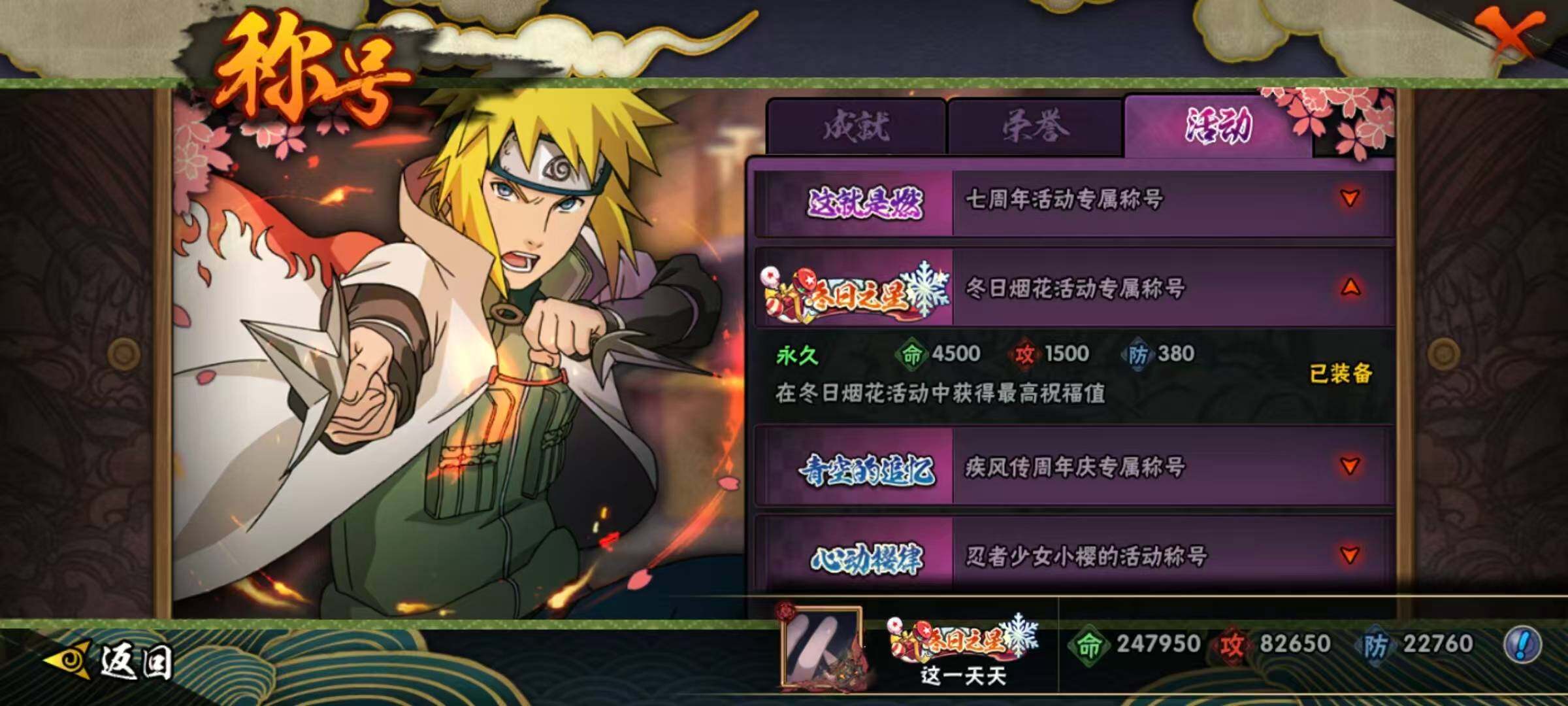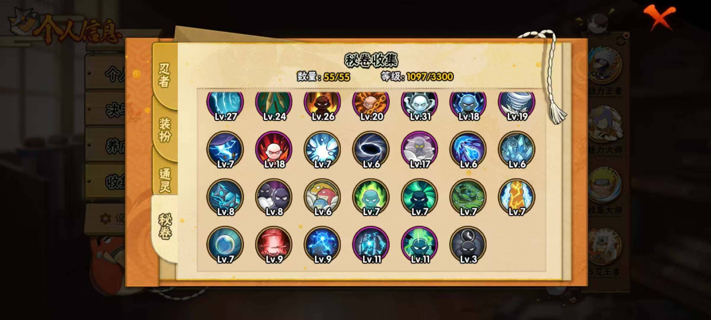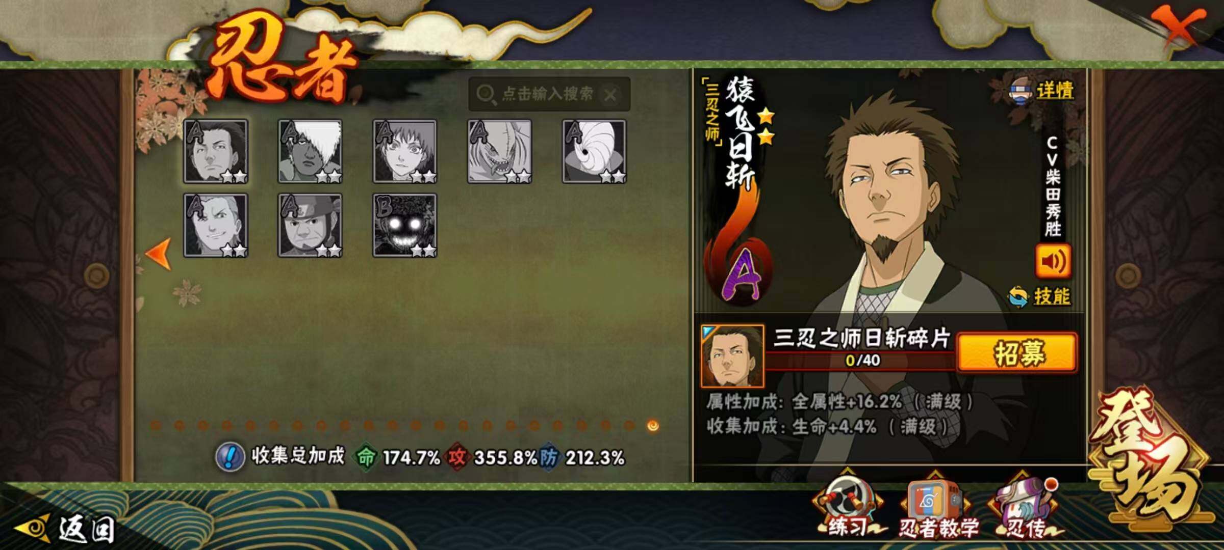 【A级忍者】:艾「青年」(3星),三船「青年」(2星),三船(2星),长门「青年」(2星),波风水门「青年」(3星),波风水门「新春限定」(2星),达鲁伊「博人传」(2星),迪达拉(3星),迪达拉「新春限定」(2星),迪达拉「秽土转生」(2星),大蛇丸「晓」(2星),大蛇丸「新春限定」(2星),奇拉比(2星),奇拉比「忍界大战」(2星),飞段(5星),飞段「死司凭血」(5星),飞段「恶灵之影」(2星),干柿鬼鲛(5星),漩涡博人「桃式显现」(2星),漩涡鸣人「仙人模式」(
