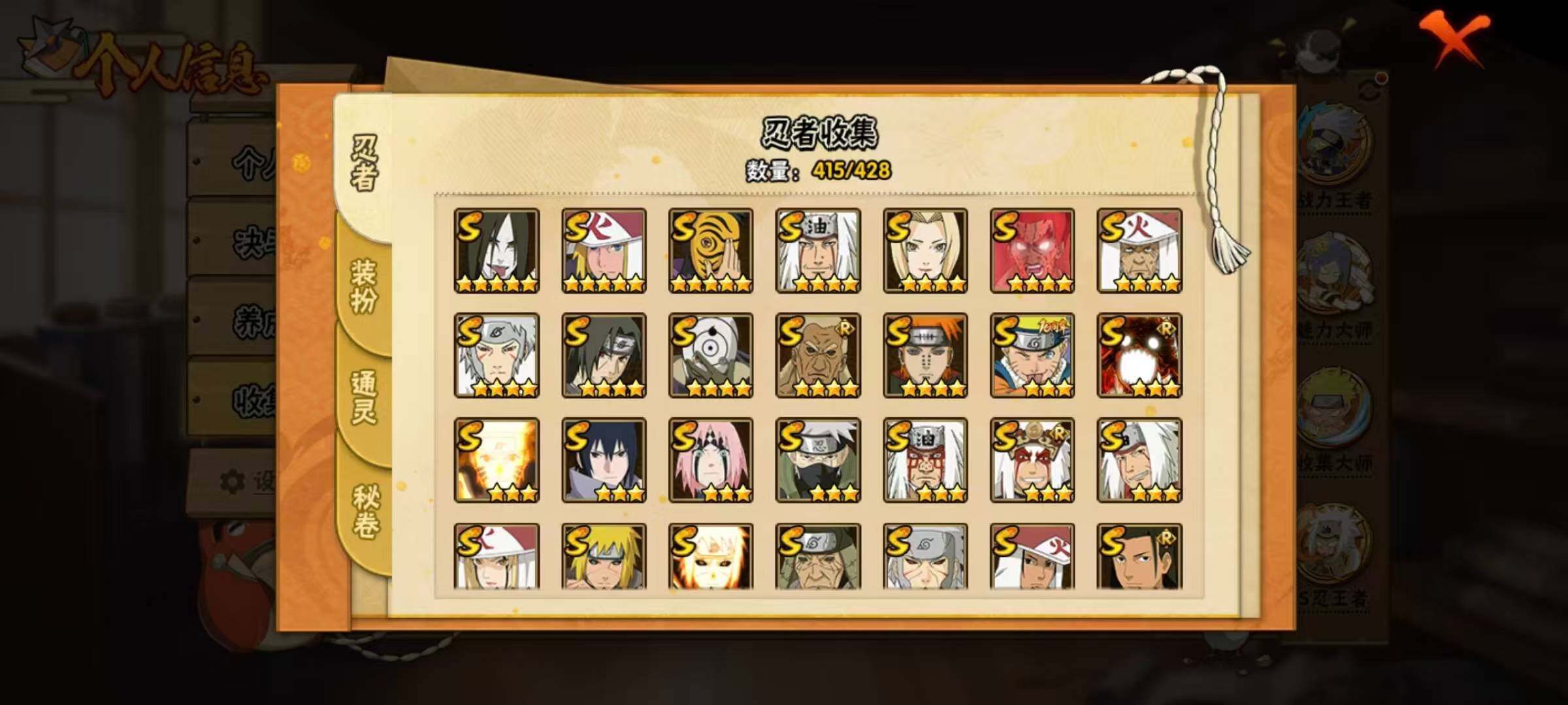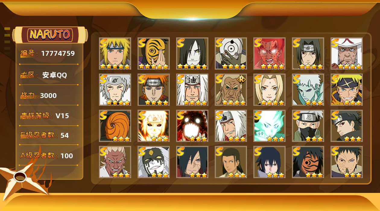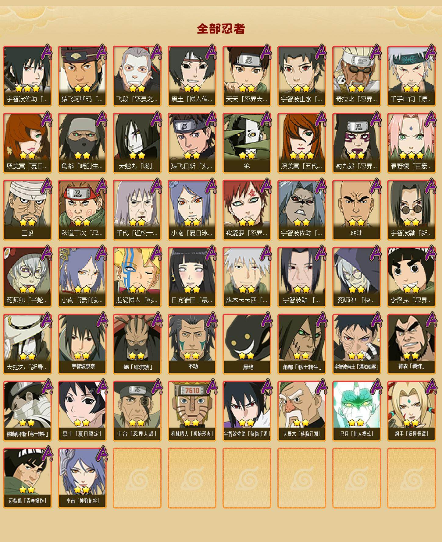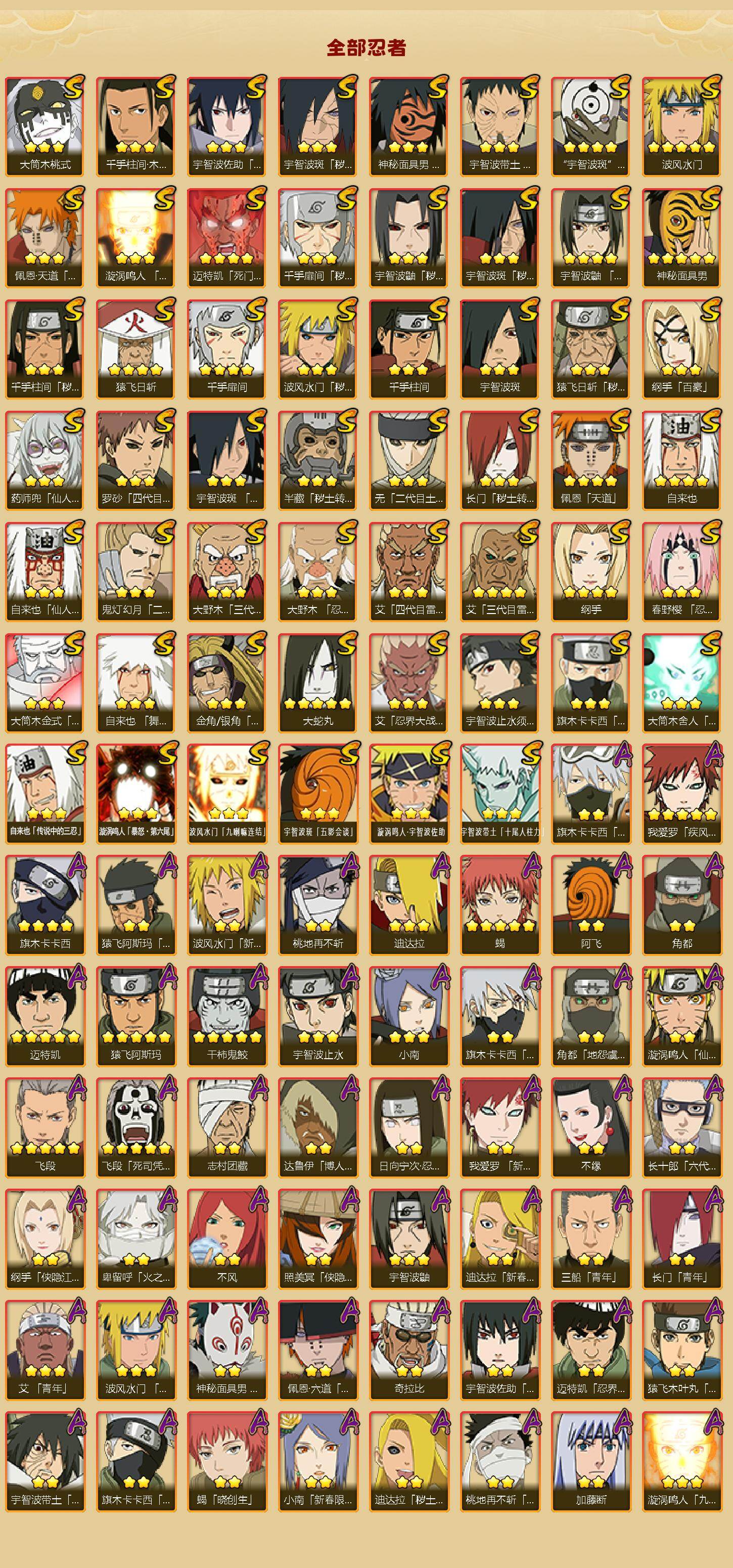 【S级忍者】:长门「秽土转生」(3星),半藏「秽土转生」(3星),金角·银角「秽土转生」(3星),猿飞日斩「秽土转生」(3星),波风水门「秽土转生」(3星),千手扉间「秽土转生」(3星),千手柱间「秽土转生」(3星),宇智波鼬「秽土转生」(3星),宇智波斑「秽土转生」(3星),宇智波斑「秽土转生·解」(3星),大野木「忍界大战」(3星),春野樱「忍界大战」(3星),宇智波带土「忍界大战」(3星),艾「忍界大战」(3星),宇智波鼬「须佐能乎」(4星),宇智波止水「须佐能乎」(3星),旗木卡卡西「须佐能乎」(3星),宇智波斑「木叶创立」(3星),千手柱间「木叶创立」(3星),无「二代目土影」(3星),艾「四代目雷影」(3星),罗砂「四代目风影」(3星),鬼灯幻月「二代目水影」(3星),大野木「三代目土影」(3星),艾「三代目雷影」(4星),自来也(4星),自来也「仙人模式」(3星),自来也「舞之豪杰」(3星),大蛇丸(5星),自来也「传说中的三忍」(3星),纲手(4星),纲手「百豪」(3星),千手柱间(3星),千手扉间(4星),猿飞日斩(4星),宇智波斑(3星),波风水门(5星),药师兜「仙人模式」(3星),神秘面具男(5星),神秘面具男「红夜之刃」(3星),漩涡鸣人「九喇嘛连结」(3星),迈特凯「死门」(4星),佩恩「天道」(4星),佩恩·天道「超」(3星),宇智波佐助「永恒万花筒」(3星),宇智波斑 「白面具」(4星宇智波斑「白面具」),大筒木金式(3星),大筒木桃式(3星),大筒木舍人「最终章」(3星),漩涡鸣人「暴怒·第六尾」(3星),波风水门「九喇嘛连结」(3星),宇智波斑「五影会谈」(3星),漩涡鸣人·宇智波佐助(3星),宇智波带土「十尾人柱力」(3星)