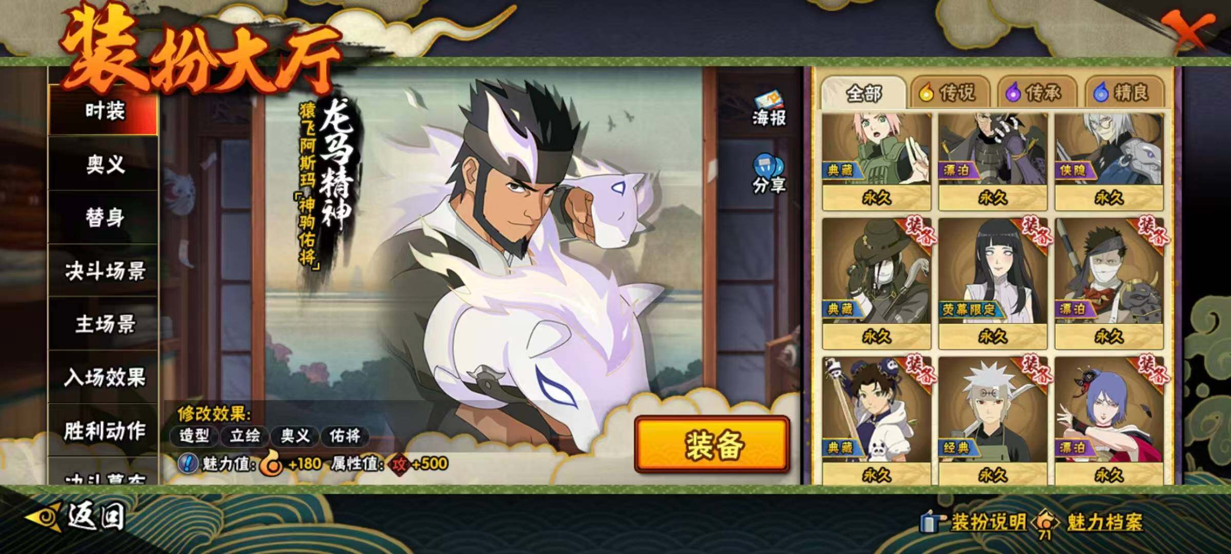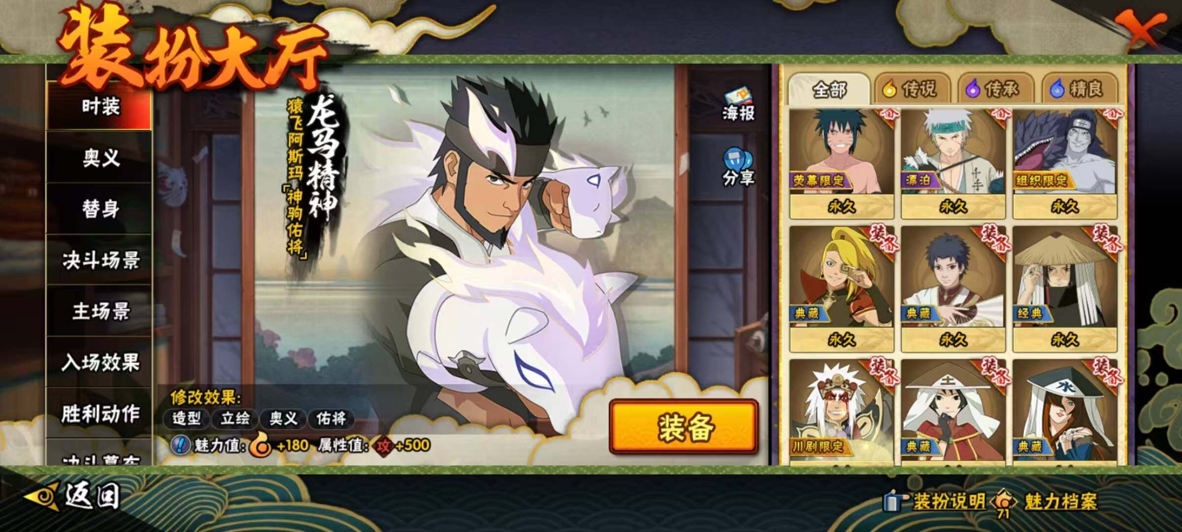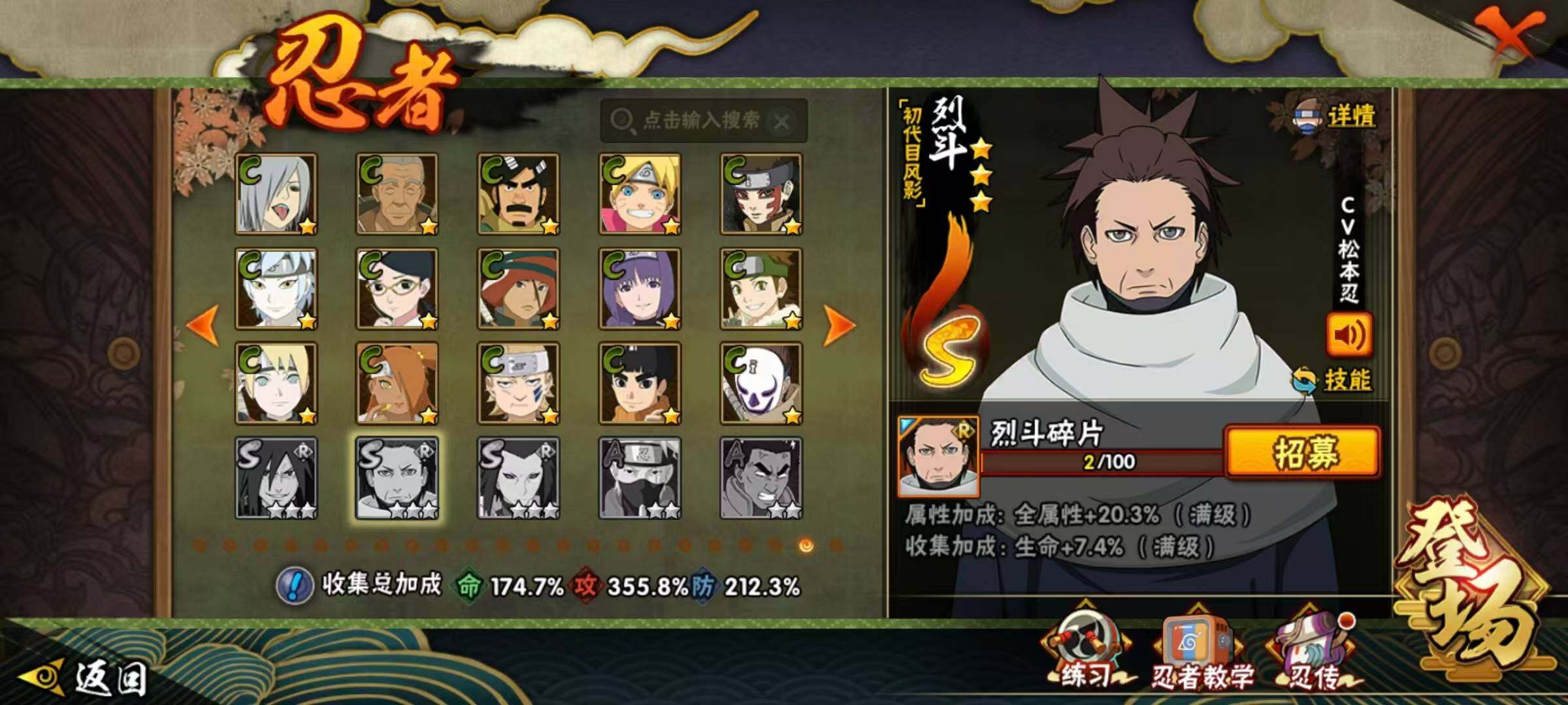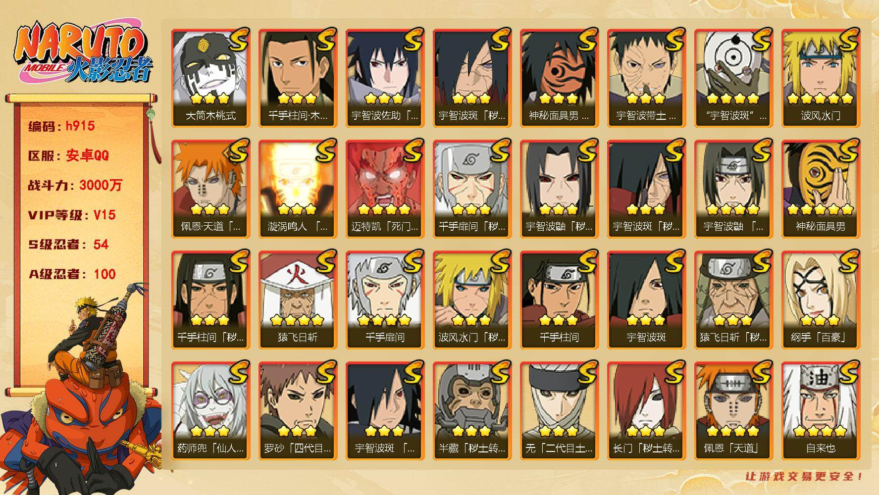 【S级忍者】:长门「秽土转生」(3星),半藏「秽土转生」(3星),金角·银角「秽土转生」(3星),猿飞日斩「秽土转生」(3星),波风水门「秽土转生」(3星),千手扉间「秽土转生」(3星),千手柱间「秽土转生」(3星),宇智波鼬「秽土转生」(3星),宇智波斑「秽土转生」(3星),宇智波斑「秽土转生·解」(3星),大野木「忍界大战」(3星),春野樱「忍界大战」(3星),宇智波带土「忍界大战」(3星),艾「忍界大战」(3星),宇智波鼬「须佐能乎」(4星),宇智波止水「须佐能乎」(3星),旗木卡卡西「须佐能乎」(3星),宇智波斑「木叶创立」(3星),千手柱间「木叶创立」(3星),无「二代目土影」(3星),艾「四代目雷影」(3星),罗砂「四代目风影」(3星),鬼灯幻月「二代目水影」(3星),大野木「三代目土影」(3星),艾「三代目雷影」(4星),自来也(4星),自来也「仙人模式」(3星),自来也「舞之豪杰」(3星),大蛇丸(5星),自来也「传说中的三忍」(3星),纲手(4星),纲手「百豪」(3星),千手柱间(3星),千手扉间(4星),猿飞日斩(4星),宇智波斑(3星),波风水门(5星),药师兜「仙人模式」(3星),神秘面具男(5星),神秘面具男「红夜之刃」(3星),漩涡鸣人「九喇嘛连结」(3星),迈特凯「死门」(4星),佩恩「天道」(4星),佩恩·天道「超」(3星),宇智波佐助「永恒万花筒」(3星),宇智波斑 「白面具」(4星宇智波斑「白面具」),大筒木金式(3星),大筒木桃式(3星),大筒木舍人「最终章」(3星),漩涡鸣人「暴怒·第六尾」(3星),波风水门「九喇嘛连结」(3星),宇智波斑「五影会谈」(3星),漩涡鸣人·宇智波佐助(3星),宇智波带土「十尾人柱力」(3星)