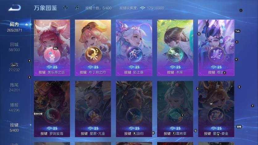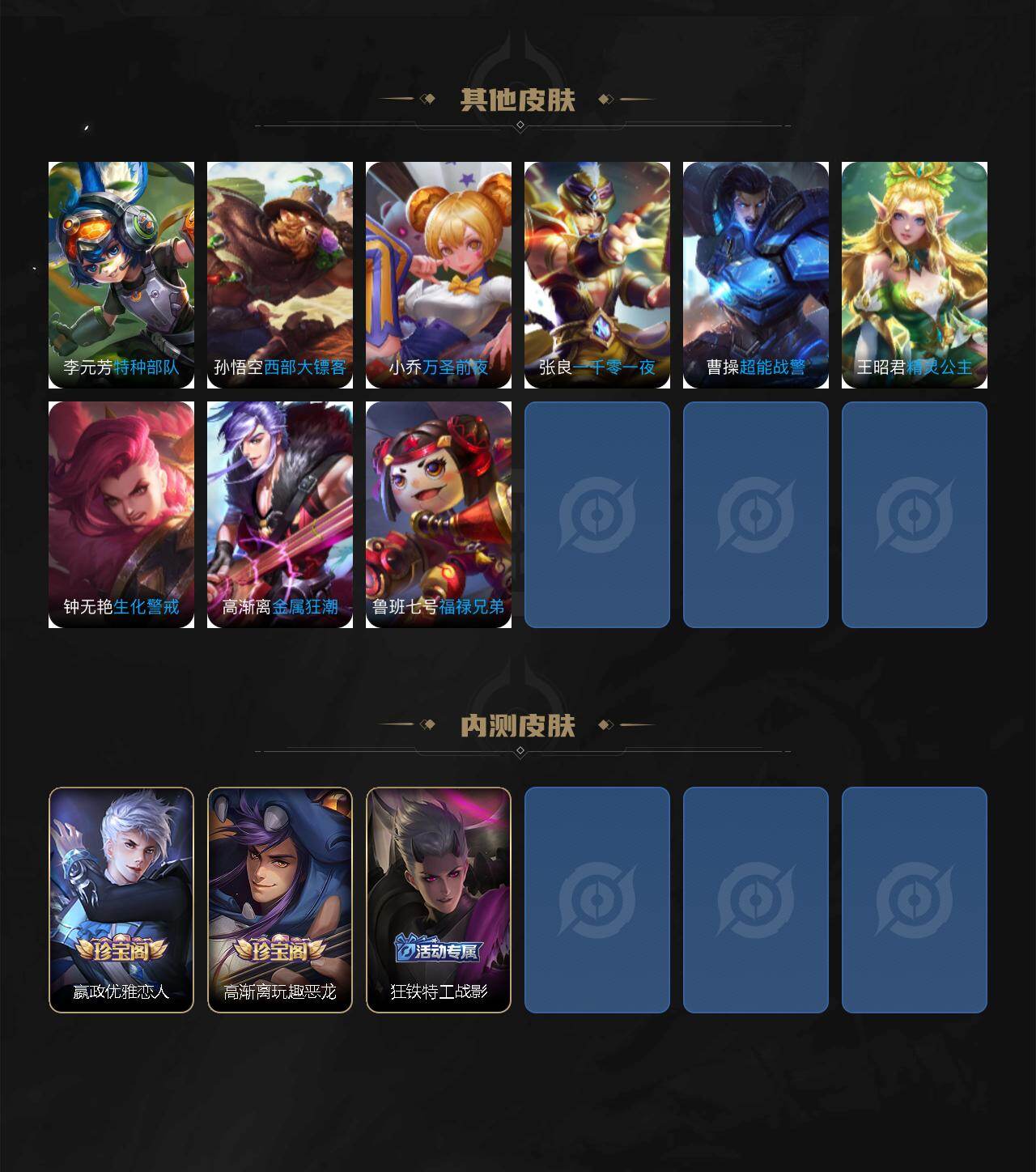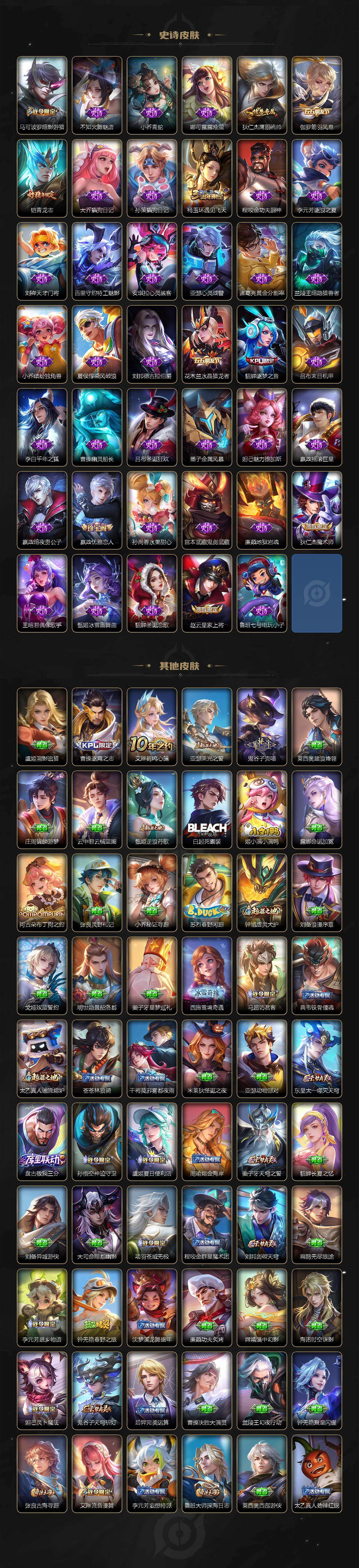 小乔青蛇,娜可露露晚萤,伽罗箭羽风息,李元芳逐浪之夏,不知火舞魅语,大乔猫狗日记,孙策猫狗日记,诸葛亮黄金分割率,王昭君偶像歌手,吕布末日机甲,鲁班七号电玩小子,嬴政摇滚巨星,刘禅天才门将,安琪拉心灵骇客,程咬金功夫厨神,刘邦德古拉伯爵,兰陵王暗隐猎兽者,曹操幽灵船长,宫本武藏鬼剑武藏,亚瑟心灵战警,廉颇地狱岩魂,小乔缤纷独角兽,夏侯惇乘风破浪,花木兰水晶猎龙者,墨子金属风暴,百里玄策原初追逐者,吕布圣诞狂欢,貂蝉圣诞恋歌,百里守约特工魅影,嬴政暗夜贵公子,雅典娜黎明之约,李白千年之狐,夏洛特永昼,貂蝉唤灵魅影,高渐离天秀·音浪,刘禅电玩·爆裂旋风,蒙犽百解令,高渐离燃音魔法