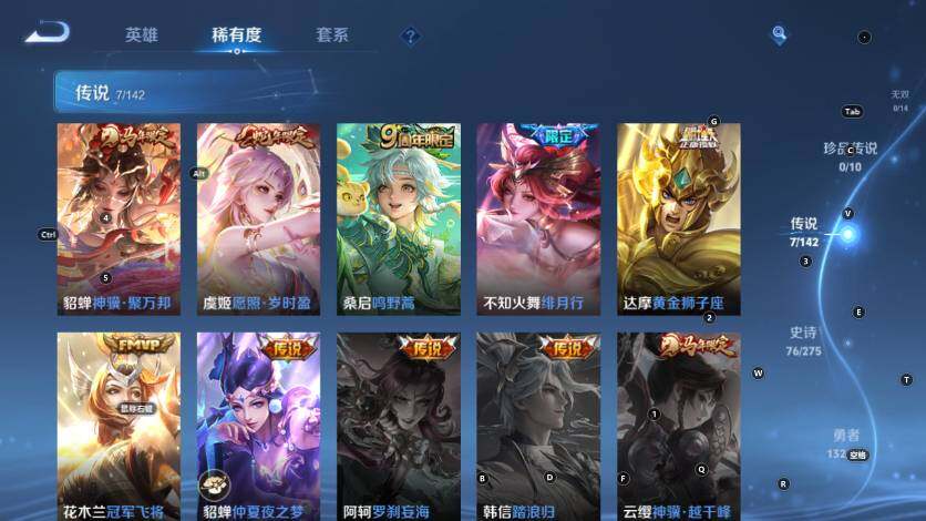 【传说皮肤】:貂蝉神骥聚万邦,虞姬愿照岁时盈,桑启鸣野蒿,不知火舞绯月行,达摩黄金狮子座,花木兰冠军飞将,貂蝉仲夏夜之梦
