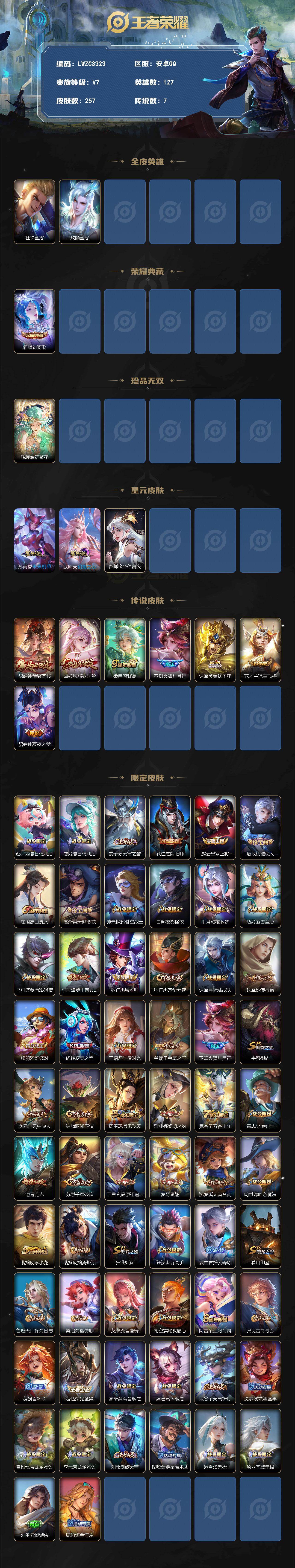 - [11956168]【商品标题】:安卓Q-V7-永恒钻石IV段位-123英雄-328皮肤-2典藏-0珍品无双-4无双-1珍品传说-40传说-96史诗 【荣耀典藏】:夏侯惇无限飓风号,瑶拾光映像 【无双皮肤】:妲己青丘九尾,小乔时之魔女,韩信群星魔术团,不知火舞花合斗 【珍品传说】:孙策时之奇旅 【传说皮肤】:澜愿照九州拓,云缨幻光神枪,桑启鸣野蒿,墨子黄金天蝎座,海月金乌负日,吕布曦玄引,貂蝉曦玄引,孙尚香乘龙问璇玑,孙策乘龙淬吴钩,赵云乘龙铭钟鼎,张飞百相守梦,虞姬无限倾心,项羽无限倾心,小乔山海琳琅生,曜山海苍雷引,李信山海炽霜斩,吕布怒海麟威,李白诗剑行,橘右京枫霜尽,孙尚香音你闪耀,孙策末日机甲,王昭君乞巧织情,兰陵王默契交锋,公孙离祈雪灵祝,诸葛亮时雨天司,镜炽阳神光,虞姬启明星使,孙悟空零号赤焰,关羽武圣,曜云鹰飞将,李信一念神魔,伽罗太华,虞姬云霓雀翎,百里玄策白虎志,后羿黄金射手座,貂蝉仲夏夜之梦,李白凤求凰,孙尚香末日机甲,孙悟空地狱火,狄仁杰超时空战士 【限定皮肤】:暃埋骨钱,蔡文姬夏日便利店,大乔绒语心约,虞姬夏日便利店,姜子牙天穹之誓,狄仁杰阴阳师,小乔山海琳琅生,赵云皇家上将,墨子降魔,妲己时之彼端,孙尚香蔷薇恋人,高渐离玩趣恶龙,阿轲迷踪丽影,钟无艳超时空战士,芈月白晶晶,芈月幻夜卜梦,吕布御风骁将,元歌云间偶戏,元歌无心,甄姬落雪兰心,马可波罗逐梦之星,马可波罗暗影游猎,马可波罗山海玄木吟,狄仁杰魔术师,狄仁杰万华元夜,达摩星际陆战队,达摩沙漠行僧,项羽海滩派对,项羽无限倾心,老夫子醍醐杖,关羽冰锋战神,关羽武圣,程咬金演武夺筹,刘邦夺宝奇兵,兰陵王默契交锋,兰陵王金庭之子,花木兰默契交锋,橘右京枫霜尽,亚瑟潮玩骑士王,孙悟空零号赤焰,牛魔奔雷神使,张飞虎魄,张飞百相守梦,李元芳银河之约,李元芳云中旅人,虞姬启明星使,虞姬无限倾心,钟馗驱傩正仪,女娲朔望之晖,干将莫邪冰霜恋舞曲,雅典娜单词大作战,东皇太一逐梦之光,鬼谷子原初探秘者,鬼谷子五谷丰年,诸葛亮时雨天司,黄忠烈魂,黄忠火炮绅士,苏烈玄武志,苏烈千军破阵,百里玄策白虎志,百里守约朱雀志,弈星混沌棋,公孙离祈雪灵祝,沈梦溪星空之诺,沈梦溪大漠名商,明世隐疑决卦,裴擒虎李小龙,裴擒虎擒涛扼浪,米莱狄胡桃异想国,瑶山海碧波行,云中君纤云弄巧,李信山海炽霜斩,伽罗太华,猪八戒西部大镖客,上官婉儿天狼绘梦者