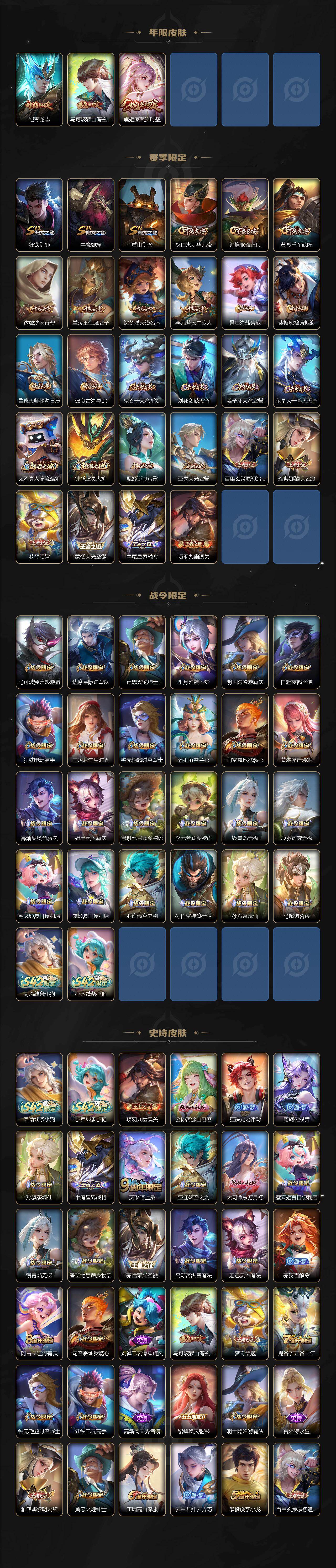 【赛季限定】:狂铁御狮,牛魔御旌,盾山御銮,狄仁杰万华元夜,钟馗驱傩正仪,苏烈千军破阵,达摩沙漠行僧,兰陵王金庭之子,沈梦溪大漠名商,李元芳云中旅人,桑启海盐诗旅,裴擒虎擒涛扼浪,鲁班大师探海日志,张良古海寻踪,鬼谷子天穹祈灯,刘邦剑破天穹,姜子牙天穹之誓,东皇太一噬灭天穹,太乙真人谧流熔炉,钟馗虚灵犬护,甄姬逆浪荇歌,亚瑟荣光之誓,百里玄策原初追逐者,雅典娜黎明之约,梦奇顽趣,蒙恬荣光圣徽,牛魔星界战将,项羽九幽镇关