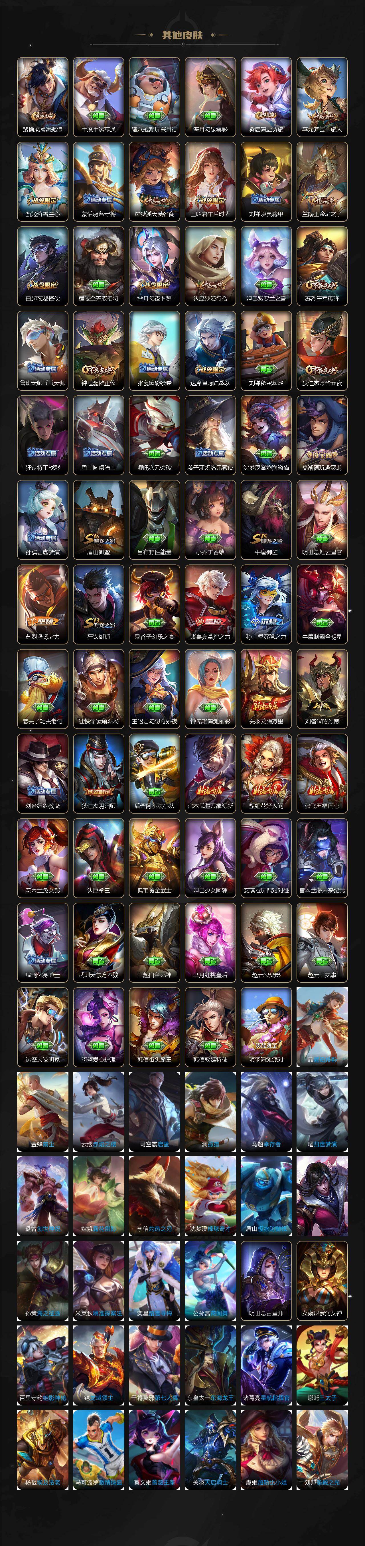 【限定皮肤】:蔡文姬夏日便利店,虞姬夏日便利店,姜子牙天穹之誓,狄仁杰阴阳师,赵云皇家上将,嬴政优雅恋人,庄周高山流水,高渐离玩趣恶龙,钟无艳超时空战士,白起夜都怪侠,芈月幻夜卜梦,甄姬落雪兰心,马可波罗暗影游猎,马可波罗山海玄木吟,狄仁杰魔术师,狄仁杰万华元夜,达摩星际陆战队,达摩沙漠行僧,项羽海滩派对,貂蝉逐梦之音,王昭君午后时光,兰陵王金庭之子,不知火舞绯月行,牛魔御旌,李元芳云中旅人,钟馗驱傩正仪,杨玉环遇见飞天,雅典娜黎明之约,鬼谷子五谷丰年,黄忠火炮绅士,铠青龙志,苏烈千军破阵,百里玄策原初追逐者,梦奇顽趣,沈梦溪大漠名商,明世隐吟游魔法,裴擒虎李小龙,裴擒虎擒涛扼浪,狂铁御狮,狂铁电玩高手,云中君纤云弄巧,盾山御銮,鲁班大师探海日志,桑启海盐诗旅,艾琳流音漫舞,司空震地狱燃心,阿古朵江河有灵,张良古海寻踪,蒙犽百解令,蒙恬荣光圣徽,高渐离燃音魔法,妲己灵卜魔法,鬼谷子天穹祈灯,沈梦溪龙舞盛年,鲁班七号蔬乡物语,李元芳蔬乡物语,刘邦剑破天穹,程咬金群星魔术团,镜青焰无极,项羽苍威无极,刘备异域游侠,周瑜熔金海岸