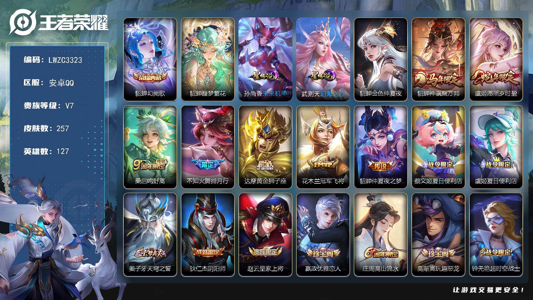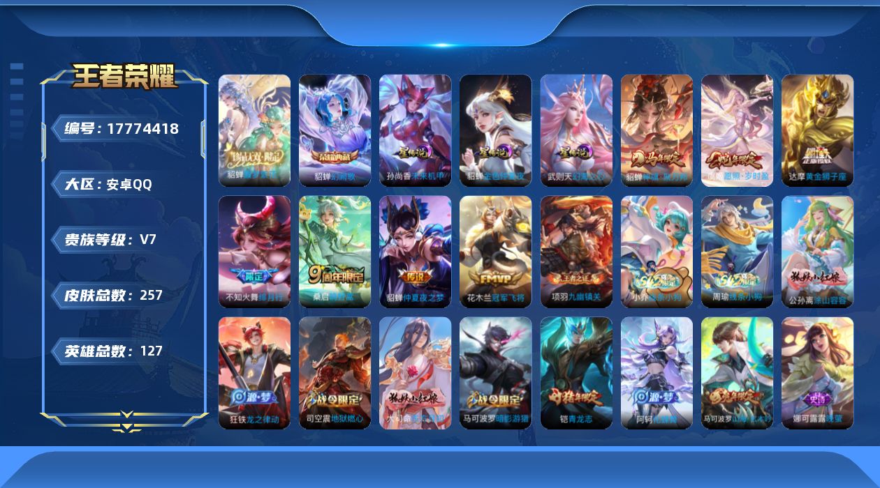 [17774418]可二次【特价出售/店主推荐/精品女号】万战貂蝉、中路30段,安卓Q-V7-最强王者段位-127英雄-257皮肤-1典藏皮肤-1珍品无双-3星传说-7传说-75史诗 【英雄全皮】:狂铁全皮,敖隐全皮 【荣耀典藏】:貂蝉幻阙歌 【珍品无双】:貂蝉馥梦繁花 【传说皮肤】:貂蝉神骥聚万邦,虞姬愿照岁时盈,桑启鸣野蒿,不知火舞绯月行,达摩黄金狮子座,花木兰冠军飞将,貂蝉仲夏夜之梦 【限定皮肤】:蔡文姬夏日便利店,虞姬夏日便利店,姜子牙天穹之誓,狄仁杰阴阳师,赵云皇家上将,嬴政优雅恋人,庄周高山流水,高渐离玩趣恶龙,钟无艳超时空战士,白起夜都怪侠,芈月幻夜卜梦,甄姬落雪兰心,马可波罗暗影游猎,马可波罗山海玄木吟,狄仁杰魔术师,狄仁杰万华元夜,达摩星际陆战队,达摩沙漠行僧,项羽海滩派对,貂蝉逐梦之音,王昭君午后时光,兰陵王金庭之子,不知火舞绯月行,牛魔御旌,李元芳云中旅人,钟馗驱傩正仪,杨玉环遇见飞天,雅典娜黎明之约,鬼谷子五谷丰年,黄忠火炮绅士,铠青龙志,苏烈千军破阵,百里玄策原初追逐者,梦奇顽趣,沈梦溪大漠名商,明世隐吟游魔法,裴擒虎李小龙,裴擒虎擒涛扼浪,狂铁御狮,狂铁电玩高手,云中君纤云弄巧,盾山御銮,鲁班大师探海日志,桑启海盐诗旅,艾琳流音漫舞,司空震地狱燃心,阿古朵江河有灵,张良古海寻踪,蒙犽百解令,蒙恬荣光圣徽,高渐离燃音魔法,妲己灵卜魔法,鬼谷子天穹祈灯,沈梦溪龙舞盛年,鲁班七号蔬乡物语,李元芳蔬乡物语,刘邦剑破天穹,程咬金群星魔术团,镜青焰无极,项羽苍威无极,刘备异域游侠,周瑜熔金海岸 【年限皮肤】:铠青龙志,马可波罗山海玄木吟,虞姬愿照岁时盈 【赛季限定】:狂铁御狮,牛魔御旌,盾山御銮,狄仁杰万华元夜,钟馗驱傩正仪,苏烈千军破阵,达摩沙漠行僧,兰陵王金庭之子,沈梦溪大漠名商,李元芳云中旅人,桑启海盐诗旅,裴擒虎擒涛扼浪,鲁班大师探海日志,张良古海寻踪,鬼谷子天穹祈灯,刘邦剑破天穹,姜子牙天穹之誓,东皇太一噬灭天穹,太乙真人谧流熔炉,钟馗虚灵犬护,甄姬逆浪荇歌,亚瑟荣光之誓,百里玄策原初追逐者,雅典娜黎明之约,梦奇顽趣,蒙恬荣光圣徽,牛魔星界战将,项羽九幽镇关 【战令限定】:马可波罗暗影游猎,达摩星际陆战队,黄忠火炮绅士,芈月幻夜卜梦,明世隐吟游魔法,白起夜都怪侠,狂铁电玩高手,王昭君午后时光,钟无艳超时空战士,甄姬落雪兰心,司空震地狱燃心,艾琳流音漫舞,高渐
