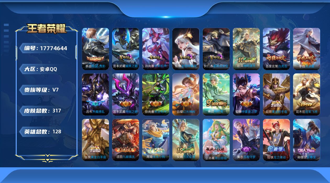 [17774644]【特价急出/详情看图】安卓Q-V7-最强王者段位-128英雄-317皮肤-1典藏皮肤-5星元-12传说-88史诗