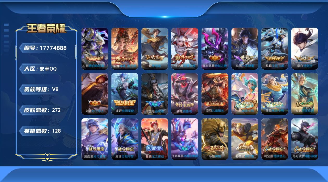 [17774888]安卓Q-V8-最强王者段位-128英雄-272皮肤-1典藏皮肤-9传说-83史诗