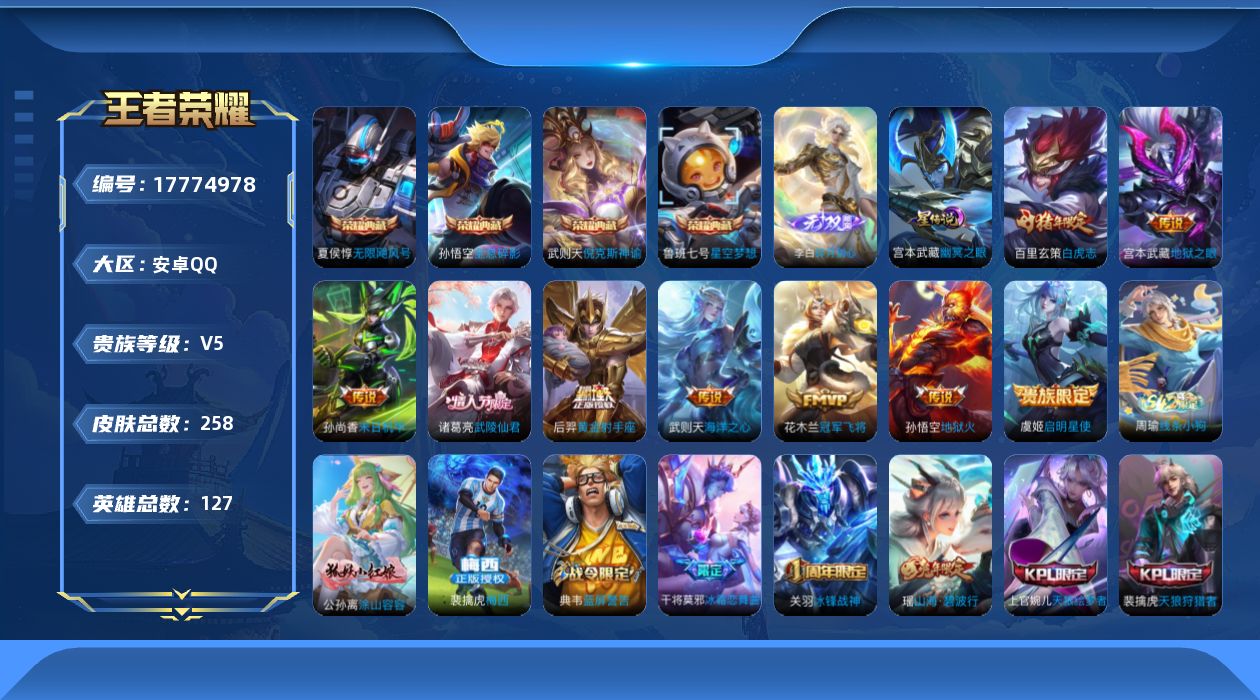 [17774978]【特价急出/详情看图】安卓Q-V5-最强王者段位-127英雄-258皮肤-4典藏皮肤-1典藏英雄-1星元-1无双-9传说-63史诗