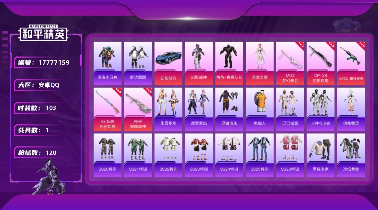 [17777159]安卓 手Q-3粉装-7特效枪-1载具-1粉色飞行器-38046热力值-14王牌印记-103套装-120枪皮