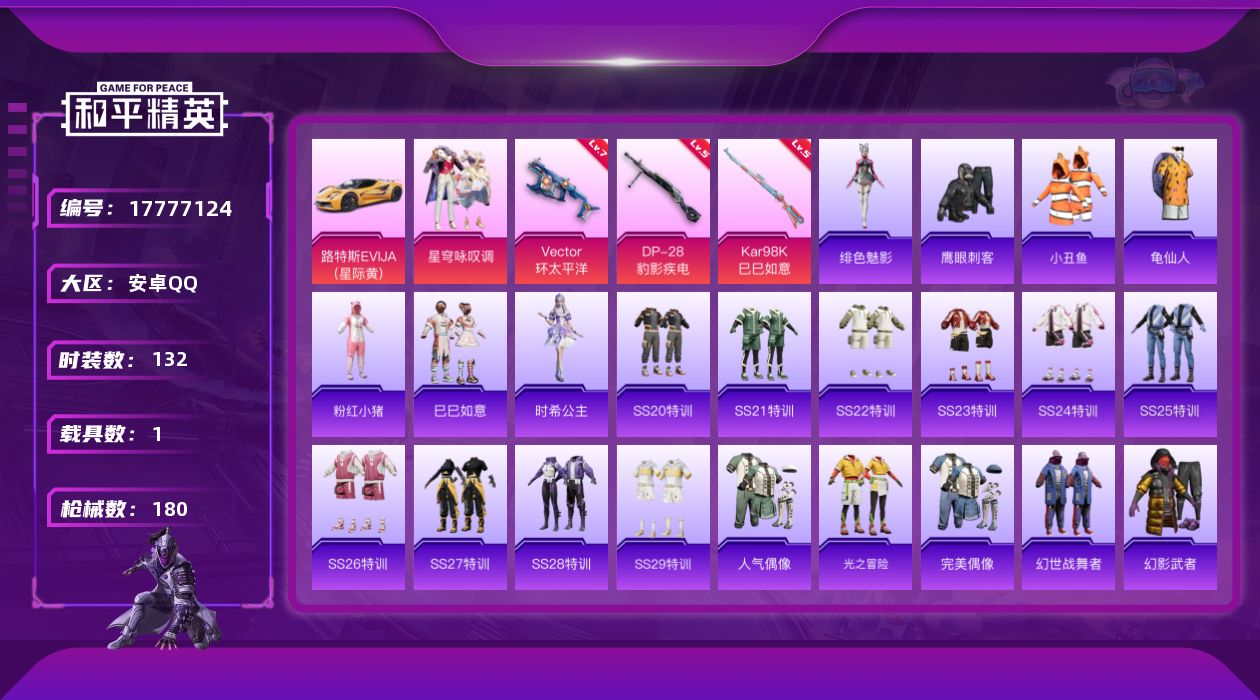 [17777124]安卓 手Q-1粉装-6特效枪-1载具-2粉色飞行器-51581热力值-9王牌印记-132套装-180枪皮