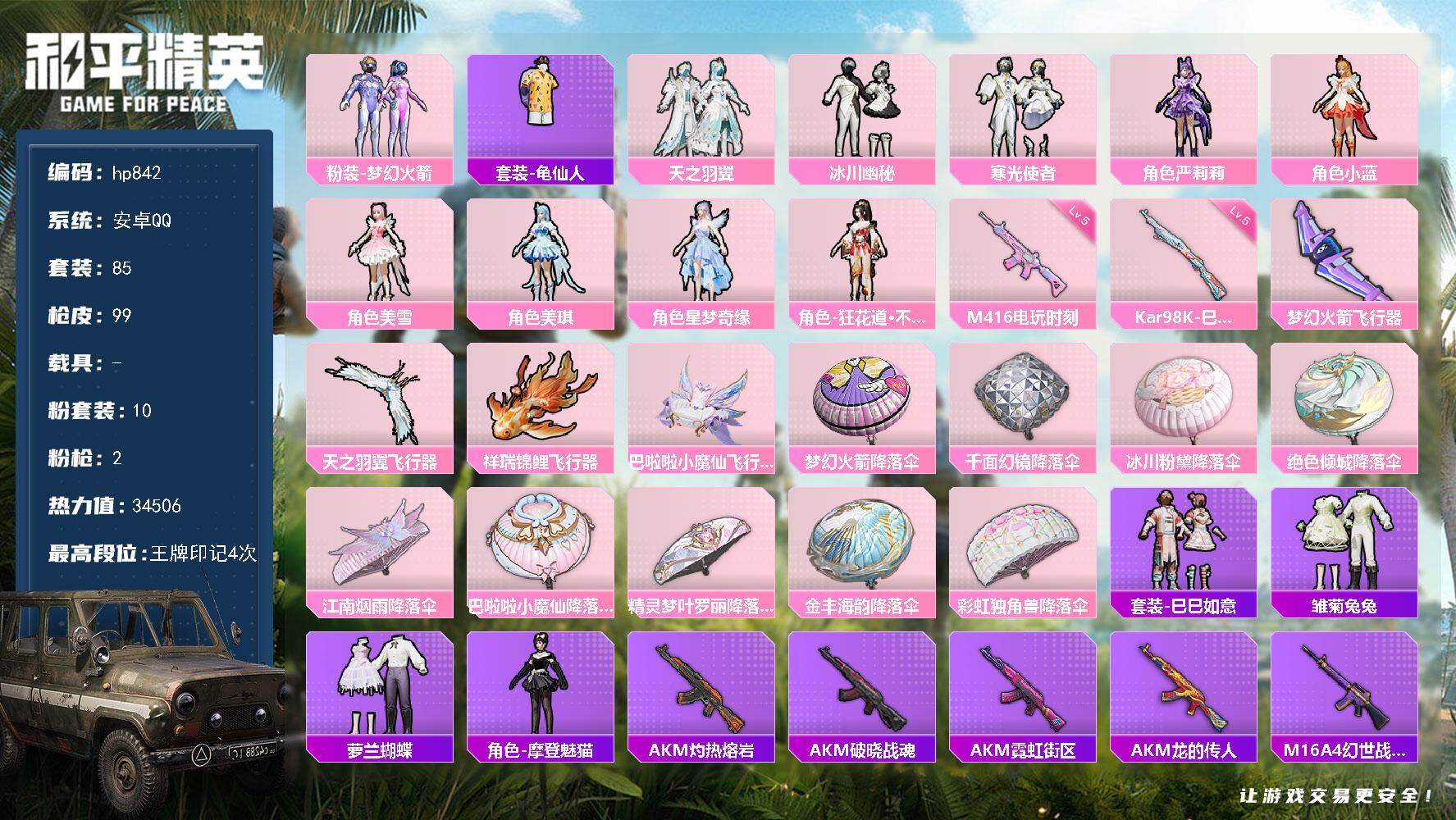 [17777259]安卓 手Q-10粉装-2特效枪-0载具-4粉色飞行器-34506热力值-4王牌印记-85套装-99枪皮