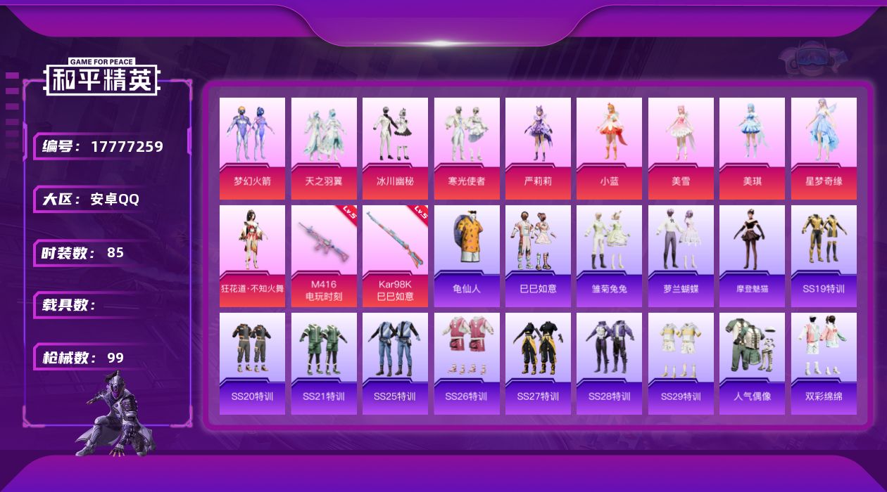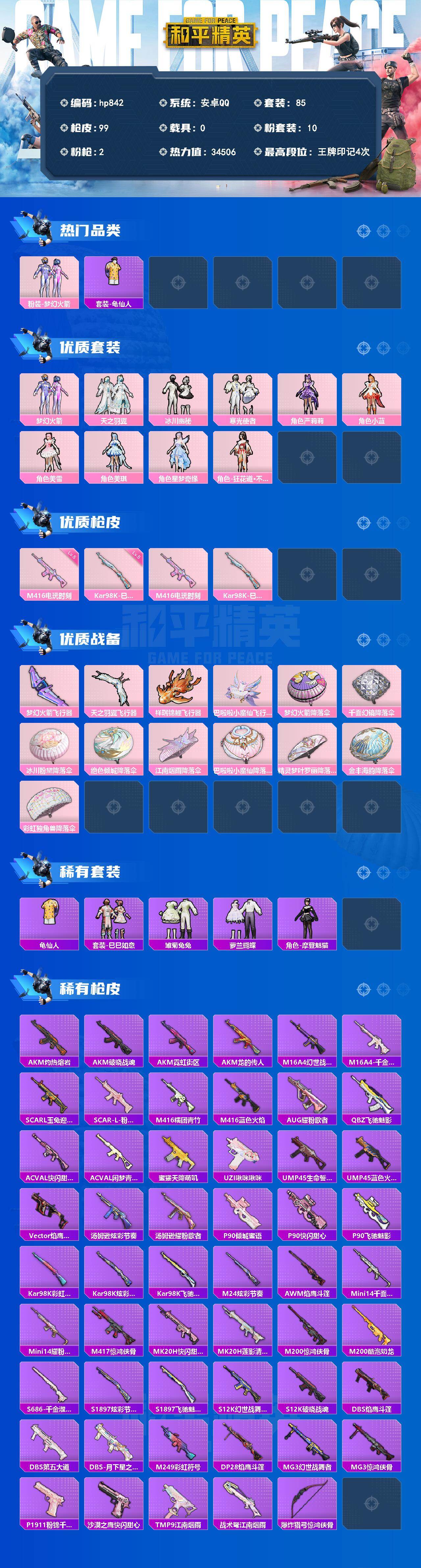 [17777259]安卓 手Q-10粉装-2特效枪-0载具-4粉色飞行器-34506热力值-4王牌印记-85套装-99枪皮 【热门品类】:粉装-梦幻火箭,套装-龟仙人 【粉色套装】:粉装-梦幻火箭,粉装-天之羽翼,粉装-冰川幽秘,粉装-寒光使者,角色-严莉莉,角色-小蓝,角色-美雪,角色-美琪,角色-星梦奇缘,角色-狂花道·不知火舞 【粉色枪皮等级】:M416-电玩时刻(五级),Kar98K-巳巳如意(五级) 【粉色枪皮】:M416-电玩时刻,Kar98K-巳巳如意 【粉色飞行器】:梦幻火箭飞行器,天之羽翼飞行器,祥瑞锦鲤飞行器,巴啦啦小魔仙飞行器 【粉色降落伞】:梦幻火箭降落伞,千面幻镜降落伞,冰川粉黛降落伞,绝色倾城降落伞,江南烟雨降落伞,巴啦啦小魔仙降落伞,精灵梦叶罗丽降落伞,金丰海韵降落伞,彩虹独角兽降落伞 【稀有套装】:套装-龟仙人,套装-巳巳如意,套装-雏菊兔兔,套装-萝兰蝴蝶,角色-摩登魅猫 【稀有枪皮】:AKM-灼热熔岩,AKM-破晓战魂,AKM-霓虹街区,AKM-龙的传人,M16A4-幻世战舞者,M16A4-千金淑猫,SCAR-L-玉兔迎春,SCAR-L-粉锦千层,M416-糯团青竹,M416-蓝色火焰,AUG-耀粉歌者,QBZ-飞驰魅影,AC-VAL-快闪甜心,AC-VAL-闲梦青缨,蜜獾-天降萌叽,UZI-啾咪啾咪,UMP45-生命誓言,UMP45-蓝色火焰,Vector-焰鹰斗篷,汤姆逊-炫彩节奏,汤姆逊-耀粉歌者,P90-倾城蜜语,P90-快闪甜心,P90-飞驰魅影,Kar98K-彩虹符号,Kar98K-炫彩节奏,Kar98K-飞驰魅影,M24-炫彩节奏,AWM-焰鹰斗篷,Mini14-千面幻镜,Mini14-耀粉歌者,M417-惊鸿侠骨,MK20-H-快闪甜心,MK20-H-莲影清波,M200-惊鸿侠骨,M200-酷泡奶龙,S686-千金淑猫,S1897-炫彩节奏,S1897-飞驰魅影,S12K-破晓战魂,S12K-幻世战舞者,DBS-焰鹰斗篷,DBS-第五大道,DBS-月下星之子,M249-彩虹符号,DP-28-焰鹰斗篷,MG3-幻世战舞者,MG3-惊鸿侠骨,P1911-粉锦千层,沙漠之鹰-快闪甜心,TMP-9-江南烟雨,战术弩-江南烟雨,爆炸猎弓-惊鸿侠骨 【其他套装】:套装-SS19特训,套装-SS20特训,套装-SS21特训,套装-SS25特训,套
