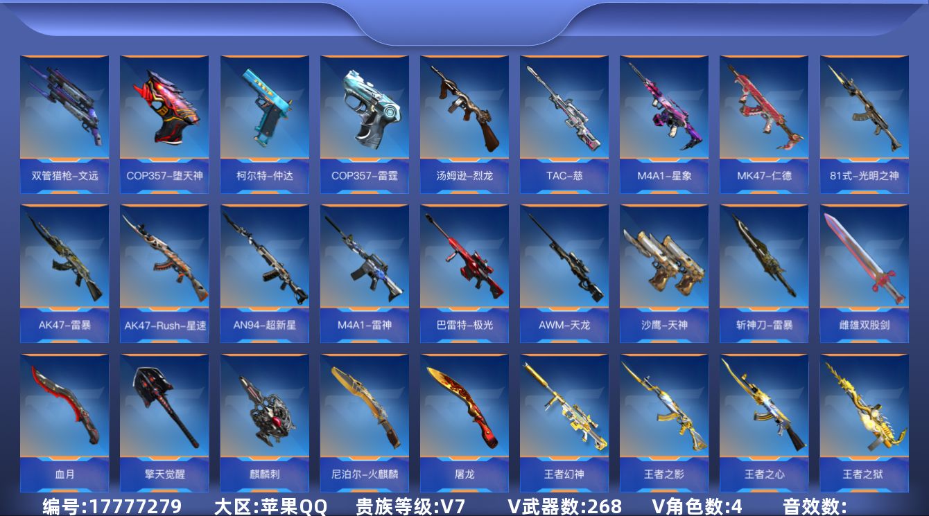 - [15781437]河南一区-99V-8王者-6炫金 【热门武器】:QBZ03-金色蔷薇*5,M4A1-青龙,M200-幻神,死亡之眼,M4A1-黑骑士*7,汤姆逊-烈龙*8,RPK-盘龙*8,加特林-炼狱*2,沙鹰-修罗*7 【王者炫金武器】:王者之幻,王者之武,王者之怒,王者之力,炫金骑士,炫金雷神*2,炫金武士,炫金毁灭*2 【音效卡】:AK47-火麒麟音效卡,M4A1-雷神音效卡,M4A1-黑骑士音效卡,Barrett-毁灭音效卡 【皮肤】:雷神-能量核心,雷神-荣耀之魄,雷神-星空,毁灭-荣耀之怒,黑骑士耀金皮肤,无影-暗月,无影-能量核心*2,无影耀金皮肤,战神-紫绶金章皮肤*3,战神-流金岁月皮肤*2,AWM-天龙-传奇70KG,极光-能量核心 【角色】:樱,战地猎狐,北极狐-X,风暴女,嘉年华灵狐,娟娟,灵狐者-黄金海岸,潘多拉-X,潜龙队-X,蛇姬,斯沃特-X,铁骑荣耀,新娜塔莎,夜玫瑰-宠粉,影武者-X 【人偶武器】:AWM-灵狐-15周年嘉年华,迷你裂空之翼*2,迷你牛魔王,迷你生化手雷,生化手雷-机甲核心,闪光弹-小乔 【暴走生化】:死亡之眼,超级对讲机 【挑战大师】:神圣爆裂者III,AK47-冰龙粉碎者,激光毁灭者III-白马银枪,VEPR-12-金魔,激光毁灭者III,神圣爆裂者-末日III*2,阐释者III*2 【英雄级武器】:AK47-火麒麟*5,M4A1-黑龙*2,M4A1-雷神*5,M4A1-黑骑士*7,AK47-无影,M4A1-死神,AK47-黑武士*3,AK12-天启*2,AN94-超新星*2,M4A1-武圣*2,AK47-黑鲨,M4A1-青龙,无影-神兵利器,QBZ03-金色蔷薇*5,王者之武-觉醒版,AK-47-猩红传说*5,AK47-B-战神,黑骑士-海王,AWM-天龙,Barrett-毁灭*3,Barrett-极光*2,AWM-裁决,M200-幻神,Barrett-金色蔷薇*4,RPK-盘龙*8,加特林-炼狱*2,汤姆逊-烈龙*8,AA-12-雷霆,沙鹰-修罗*7,沙鹰-天神*2,屠龙*4,龙啸,擎天,麒麟刺*4,闪光弹-雷霆王者-觉醒版,烟雾弹-雷霆王者-觉醒版,M4A1-赤狱骑士 【道具】:CFS限定背包,云山科技背包,全能枪王背包,炫彩背包,老虎背包,超级背包,女皇终结者-魔龙之吻,救世主-黑桃战神,绿色巨人,灵魂忍者,变异宝贝