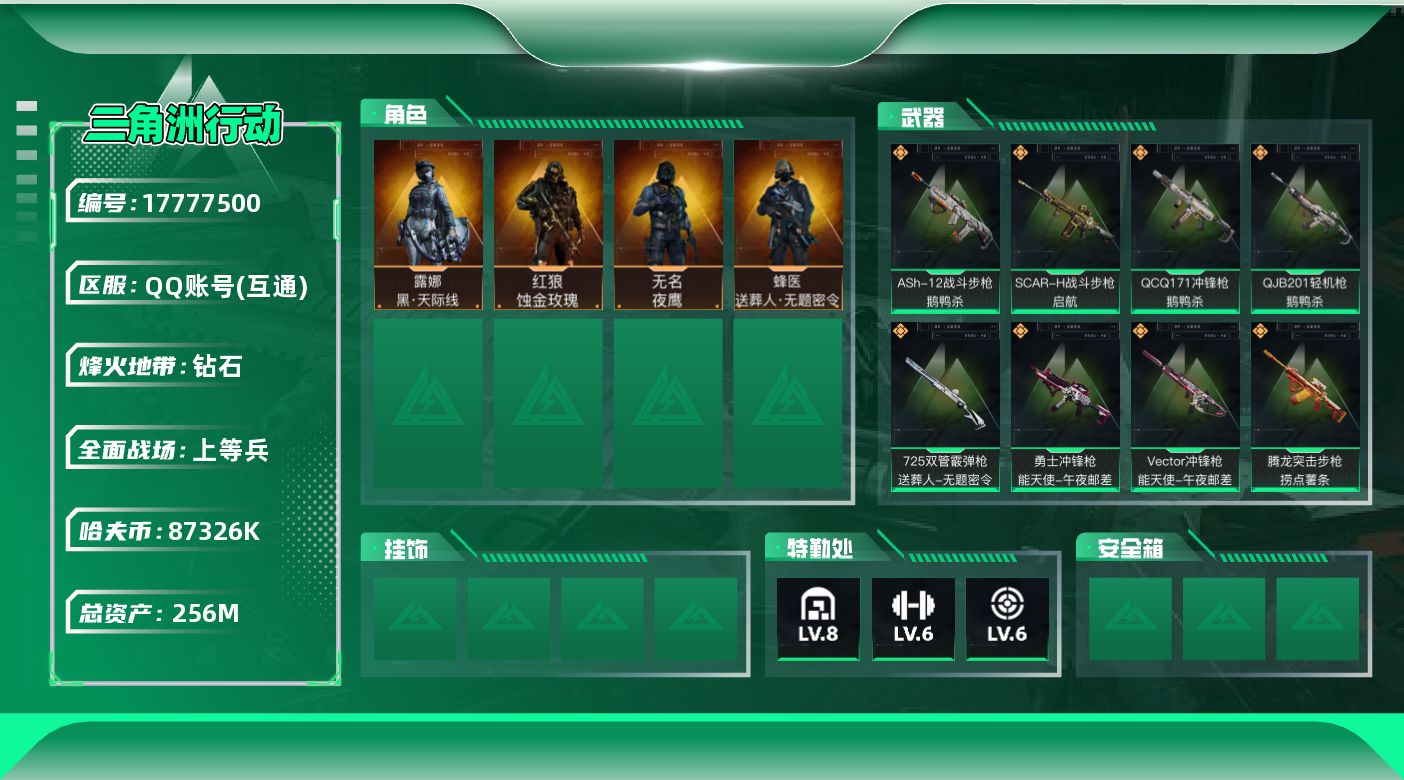 [17777500]【店主推荐捡漏号!可直接换绑】87326k哈伏币-223m流动资产-60烽火等级-钻石-20战场等级-上等兵 【干员外观】:红狼-蚀金玫瑰,露娜-黑·天际线,蜂医-送葬人·无题密令,无名-夜鹰 【近战皮肤】:近战-黑鹰 【典藏外观】:AK-12突击步枪-极地勘察队,K416突击步枪-纯白涂装,AKM突击步枪-淘金者,G3战斗步枪-水墨迷彩,AKS-74U突击步枪-蛇纹涂装,AS Val突击步枪-蝴蝶,AKM突击步枪-黄铜 【传说级普通外观】:M4A1突击步枪-蚀金玫瑰,M4A1突击步枪-阿米娅,ASh-12战斗步枪-鹅鸭杀,AK-12突击步枪-夜鹰,AK-12突击步枪-特斯拉线圈,SCAR-H战斗步枪-启航,CAR-15突击步枪-黑鹰坠落,CAR-15突击步枪-阿米娅,腾龙突击步枪-捞点薯条,Vector冲锋枪-能天使-午夜邮差,UZI冲锋枪-特斯拉线圈,SMG-45冲锋枪-骑士,SR-3M紧凑突击步枪-特斯拉线圈,勇士冲锋枪-能天使-午夜邮差,QCQ171冲锋枪-鹅鸭杀,725双管霰弹枪-送葬人-无题密令,QJB201轻机枪-鹅鸭杀,AWM狙击步枪-捞点薯条,93R-捞点薯条,复合弓-黑·天际线 【史诗级普通外观】:AKM突击步枪-林中猎手,QBZ95-1突击步枪-曙光,ASh-12战斗步枪-守夜人,M16A4突击步枪-竞赛选手,AUG突击步枪-蝮蛇,SG552突击步枪-尖端治疗,SG552突击步枪-深海恐惧,SCAR-H战斗步枪-囚徒,AS Val突击步枪-尖端治疗,AS Val突击步枪-典狱官,腾龙突击步枪-无垢,MP5冲锋枪-深海恐惧,MP5冲锋枪-竞技风,Vector冲锋枪-阿萨拉文明,Vector冲锋枪-猎鳄行动,SR-3M紧凑突击步枪-荒野求生,SR-3M紧凑突击步枪-战术竞备,勇士冲锋枪-深海恐惧,勇士冲锋枪-工业狂潮,MP7冲锋枪-无垢,M1014霰弹枪-林中猎手,S12K霰弹枪-曙光,PKM通用机枪-蝮蛇,PKM通用机枪-守夜人,PKM通用机枪-荒野求生,M250通用机枪-囚徒,SVD狙击步枪-阿萨拉工艺,SVD狙击步枪-暗夜猎手,SVD狙击步枪-荒野求生,M14射手步枪-黑鹰坠落,M14射手步枪-禁卫,SR-25射手步枪-尖端治疗,PSG-1射手步枪-无垢,SV-98狙击步枪-林中猎手,SV-98狙击步枪-囚徒,SV-98狙击步枪-猎鳄行