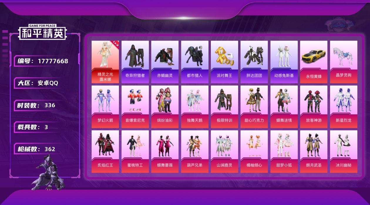 [17777668]安卓 手Q-1神装-26粉装-13特效枪-3载具-9粉色飞行器-133796热力值-20王牌印记-336套装-362枪皮