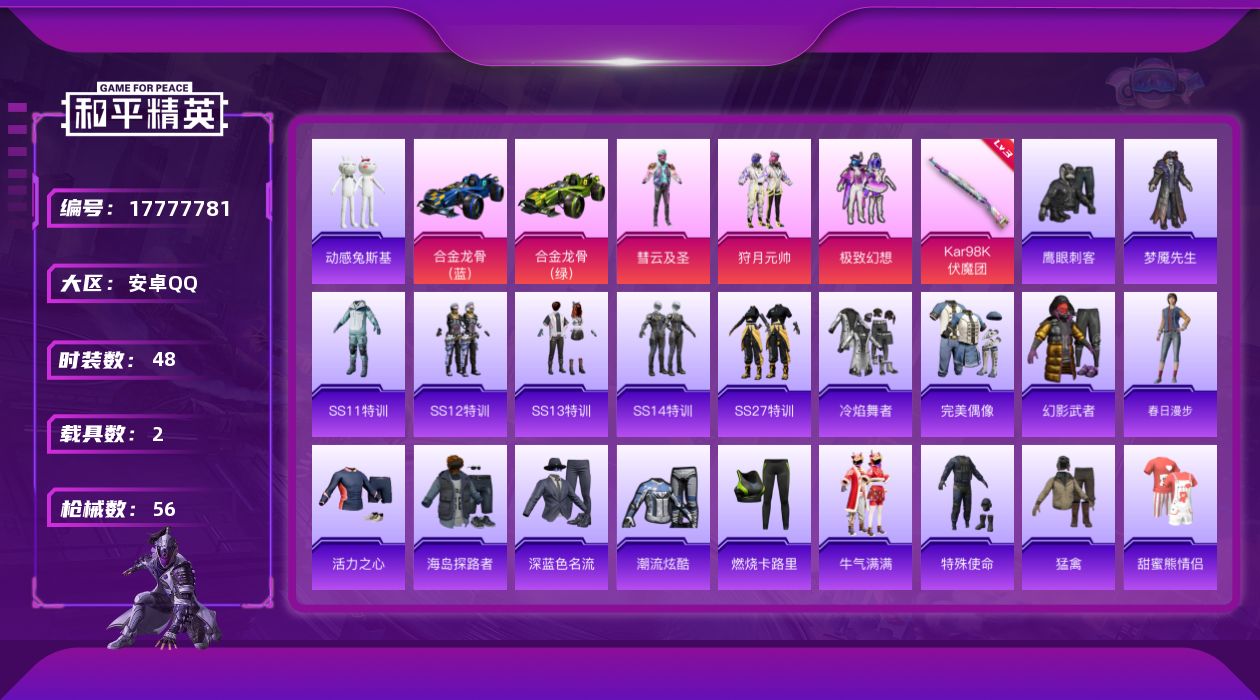 [17777781]安卓 手Q-3粉装-3特效枪-2载具-1粉色飞行器-18099热力值-2王牌印记-48套装-56枪皮
