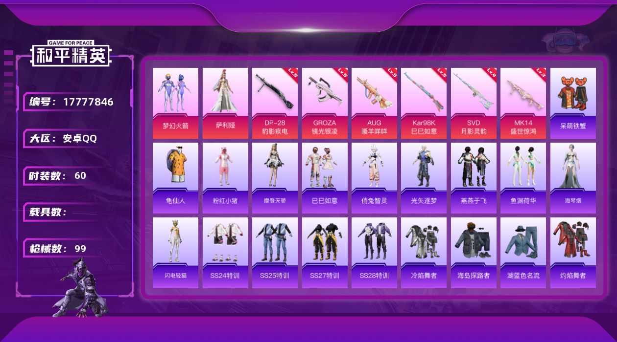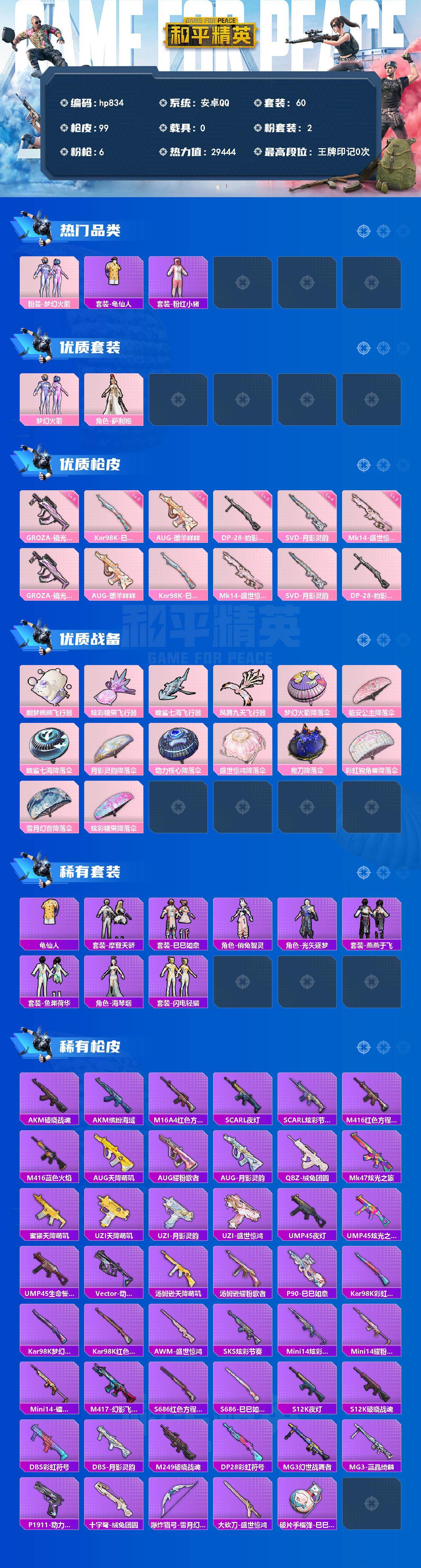 [17777846]安卓 手Q-2粉装-6特效枪-0载具-4粉色飞行器-29444热力值-2王牌印记-60套装-99枪皮 【热门品类】:粉装-梦幻火箭,套装-龟仙人,套装-粉红小猪 【粉色套装】:粉装-梦幻火箭,角色-萨利娅 【粉色枪皮等级】:GROZA-镜光银凌(五级),AUG-暖羊咩咩(五级),Kar98K-巳巳如意(五级),Mk14-盛世惊鸿(三级),SVD-月影灵韵(四级),DP-28-豹影疾电(五级) 【粉色枪皮】:GROZA-镜光银凌,AUG-暖羊咩咩,Kar98K-巳巳如意,Mk14-盛世惊鸿,SVD-月影灵韵,DP-28-豹影疾电 【粉色飞行器】:酣梦熊熊飞行器,炫彩糖果飞行器,脆鲨七海飞行器,凤舞九天飞行器 【粉色降落伞】:梦幻火箭降落伞,临安公主降落伞,脆鲨七海降落伞,月影灵韵降落伞,动力核心降落伞,盛世惊鸿降落伞,鬼刀降落伞,彩虹独角兽降落伞,雪月幻音降落伞,炫彩糖果降落伞 【稀有套装】:套装-龟仙人,套装-摩登天骄,套装-巳巳如意,套装-炫彩糖果,角色-俏兔智灵,角色-光矢逐梦,套装-燕燕于飞,套装-鱼渊荷华,角色-海琴烟,套装-闪电轻猫 【稀有枪皮】:AKM-破晓战魂,AKM-缤纷海域,M16A4-红色方程式,SCAR-L-夜灯,SCAR-L-炫彩节奏,M416-红色方程式,M416-蓝色火焰,AUG-天降萌叽,AUG-耀粉歌者,AUG-月影灵韵,QBZ-绒兔团圆,Mk47-炫光之旅,蜜獾-天降萌叽,UZI-天降萌叽,UZI-盛世惊鸿,UZI-月影灵韵,UMP45-夜灯,UMP45-炫光之旅,UMP45-生命誓言,Vector-动力核心,汤姆逊-天降萌叽,汤姆逊-耀粉歌者,P90-巳巳如意,Kar98K-彩虹符号,Kar98K-梦幻火箭,Kar98K-红色方程式,AWM-盛世惊鸿,SKS-炫彩节奏,Mini14-炫彩节奏,Mini14-耀粉歌者,Mini14-镭金极速,M417-幻影飞狐,S686-红色方程式,S686-巳巳如意,S12K-破晓战魂,S12K-夜灯,DBS-彩虹符号,DBS-月影灵韵,M249-破晓战魂,DP-28-彩虹符号,MG3-幻世战舞者,MG3-蓝晶绮麟,P1911-动力核心,十字弩-绒兔团圆,爆炸猎弓-雪月幻音,大砍刀-盛世惊鸿,破片手榴弹-巳巳如意 【其他套装】:套装-SS24特训,套装-SS25特训,套装-SS27特训,套装-S