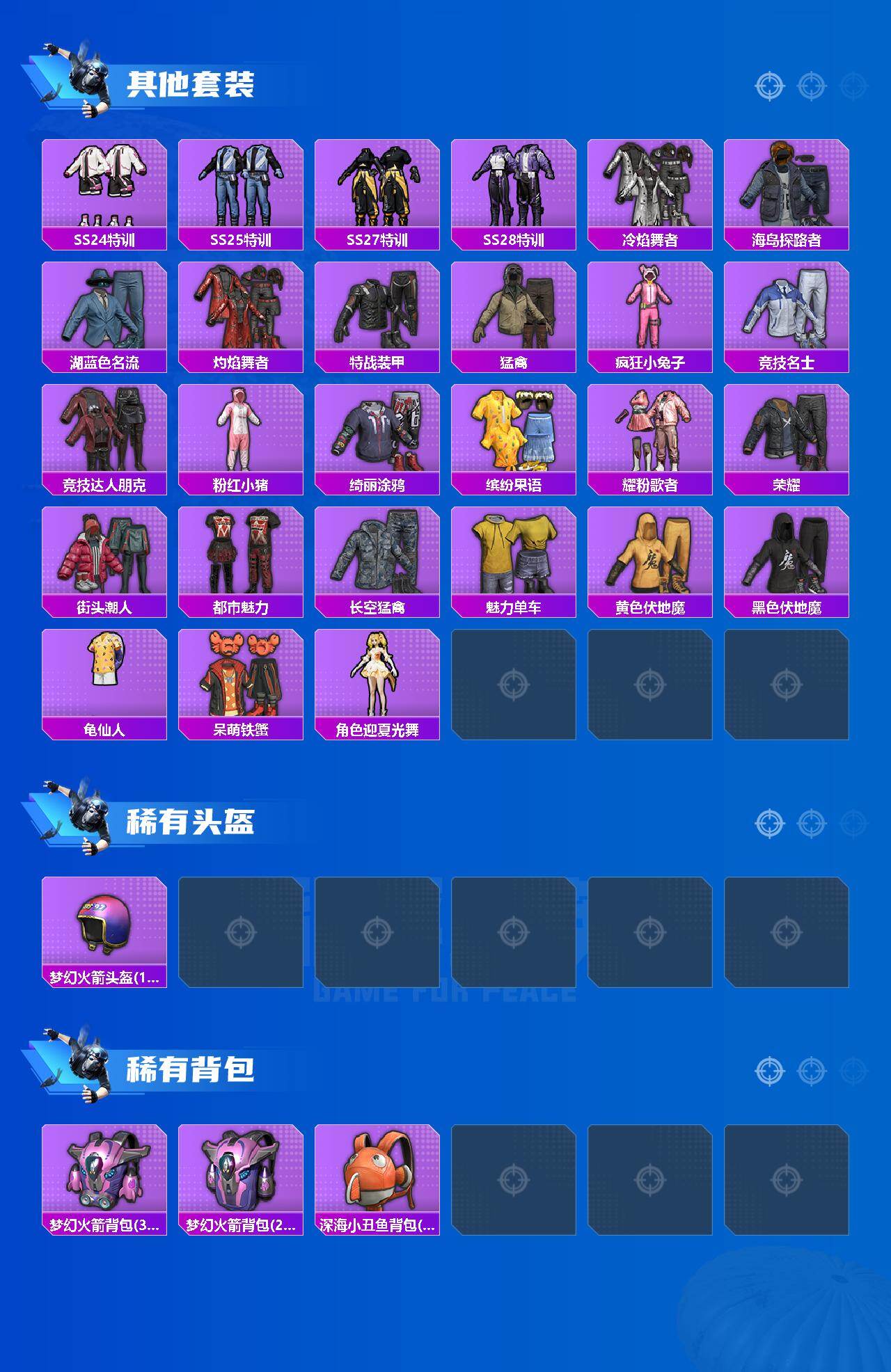 - [17328993]安卓 手Q-7粉装-12特效枪-4载具-4粉色飞行器-80411热力值-12王牌印记-155套装-239枪皮 【热门品类】:粉装-梦幻火箭,粉装-缤纷油彩,套装-都市猎人,套装-冥河战士,套装-奇异狩猎者,角色-军刀雅典娜,套装-金羽特工,套装-浪客战士,角色-忠义严颜,套装-六号树人,套装-龟仙人,套装-暗影哥特,角色-Mark.06,角色-六号稻草人,大砍刀-青龙偃月刀,撬棍-龙胆亮银枪,套装-红熊茄茄 【粉色套装】:粉装-梦幻火箭,粉装-缤纷油彩,角色-复仇流浪者,粉装-朗月武圣,粉装-炫光之旅,角色-脉冲星,粉装-星穹咏叹调 【粉色枪皮等级】:AKM-绿萝繁花(五级),SCAR-L-锦绣绵绵(五级),M416-五爪金龙(七级),GROZA-镜光银凌(五级),AUG-暖羊咩咩(五级),M762-冷魅冰骑(七级),UMP45-量子极限(五级),Vector-环太平洋(七级),Kar98K-巳巳如意(五级),Mk14-甜梦熊击(五级),DP-28-豹影疾电(五级),烟雾弹-甜梦果泡(五级) 【粉色载具】:路特斯ELETRE(花绽灰),玛莎拉蒂Quattroporte(夜幕蓝),焰龙咆哮,赤兔 【粉色枪皮】:AKM-绿萝繁花,SCAR-L-锦绣绵绵,M416-五爪金龙,GROZA-镜光银凌,AUG-暖羊咩咩,M762-冷魅冰骑,UMP45-量子极限,Vector-环太平洋,Kar98K-巳巳如意,Mk14-甜梦熊击,DP-28-豹影疾电,烟雾弹-甜梦果泡 【粉色飞行器】:炫彩糖果飞行器,星夜魔法师飞行翼,镜光幻境飞行翼,沙丘之主天马 【粉色降落伞】:至尊龙雀降落伞,冷魅冰骑降落伞,星夜魔法师降落伞,环太平洋降落伞,超新星降落伞,龙行天下降落伞,沙丘之主降落伞,猪猪侠降落伞,江南烟雨降落伞,炫彩糖果降落伞 【稀有套装】:套装-龟仙人,套装-巳巳如意,套装-燕燕于飞,套装-鱼渊荷华,套装-粉恋花,套装-紫幽梦,套装-蓝冰羽,角色-六号稻草人,套装-星影赞美诗,套装-霓虹热舞,套装-云朵鹅,套装-雪绒豹 【稀有枪皮】:AKM-夜灯,AKM-彩虹符号,AKM-影袭,AKM-星之彼岸,AKM-灼热熔岩,AKM-环太平洋,AKM-破晓战魂,AKM-缤纷海域,AKM-虎虎生威,AKM-龙的传人,M16A4-冥河战士,M16A4-幻世战舞者,M16A4-甜心亚梦,SCAR-L-夜