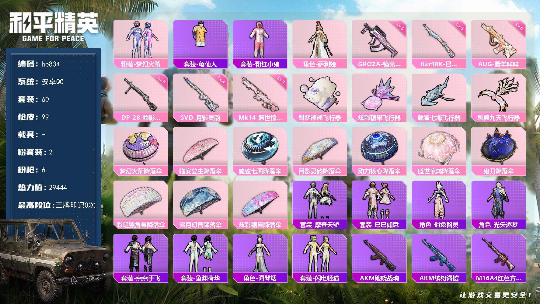 [17777846]安卓 手Q-2粉装-6特效枪-0载具-4粉色飞行器-29444热力值-2王牌印记-60套装-99枪皮