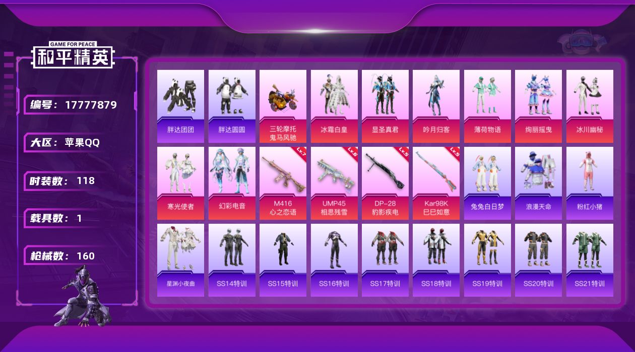 [17777879]苹果 手Q-8粉装-4特效枪-1载具-1粉色飞行器-52794热力值-7王牌印记-118套装-160枪皮