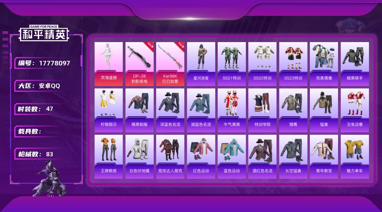 [17778097]安卓 手Q-1粉装-5特效枪-0载具-1粉色飞行器-20411热力值-2王牌印记-47套装-83枪皮 【热门品类】:套装-星河浪客 【粉色套装】:角色-荧海星豚 【粉色枪皮等级】:AKS-74U-森灵之息(四级),Kar98K-巳巳如意(五级),Mk14-福马献瑞(五级),AA12-G-萌骑幻想(四级),DP-28-豹影疾电(五级) 【粉色枪皮】:AKS-74U-森灵之息,Kar98K-巳巳如意,Mk14-福马献瑞,AA12-G-萌骑幻想,DP-28-豹影疾电 【粉色飞行器】:炫彩糖果飞行器 【粉色降落伞】:星穹咏叹调降落伞,炫彩糖果降落伞 【稀有套装】:套装-炫彩糖果,套装-马上来财 【稀有枪皮】:AUG-冰晶雪宝,AKM-破晓战魂,AKM-龙的传人,M16A4-蓝色火焰,SCAR-L-炫彩节奏,SCAR-L-玉兔迎春,M416-红色方程式,AUG-耀粉歌者,QBZ-彩虹符号,M762-天降萌叽,G36C-星穹咏叹调,AC-VAL-天降萌叽,UZI-啾咪啾咪,UMP45-蓝色火焰,汤姆逊-环太平洋,汤姆逊-耀粉歌者,汤姆逊-像素花束,Kar98K-红色方程式,M24-炫彩节奏,SKS-炫彩节奏,SKS-糯团青竹,Mini14-耀粉歌者,S686-红色方程式,S1897-炫彩节奏,S12K-破晓战魂,S12K-夜灯,M249-破晓战魂,M249-糯团青竹,MG3-幻世战舞者,R45-幻彩电音 【其他套装】:套装-SS21特训,套装-SS22特训,套装-SS23特训,套装-完美偶像,套装-暗黑骑手,套装-柠萌假日,套装-橘黑制服,套装-深蓝色名流,套装-湖蓝色名流,套装-牛气满满,套装-特训学院,套装-猎鹰,套装-猛禽,套装-玉兔迎春,套装-王牌教练,套装-白色伏地魔,套装-竞技达人朋克,套装-红色运动,套装-蓝色运动,套装-酒红色名流,套装-长空猛禽,套装-青年教官,套装-魅力单车,套装-麻辣教官,套装-黄色伏地魔,套装-黄色运动,套装-黑色伏地魔,套装-莱茵河畔 【营地ID】:706477428
