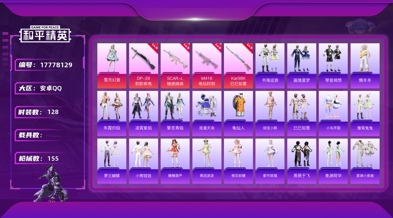 [17778129]安卓 手Q-1粉装-5特效枪-0载具-2粉色飞行器-42604热力值-12王牌印记-128套装-155枪皮 【热门品类】:套装-浪漫天命,套装-龟仙人 【粉色套装】:粉装-雪月幻音 【粉色枪皮等级】:SCAR-L-锦绣绵绵(五级),M416-电玩时刻(五级),Kar98K-巳巳如意(五级),Mk14-福马献瑞(一级),DP-28-豹影疾电(五级) 【粉色枪皮】:SCAR-L-锦绣绵绵,M416-电玩时刻,Kar98K-巳巳如意,Mk14-福马献瑞,DP-28-豹影疾电 【粉色飞行器】:炫彩糖果飞行器,夜幕颂歌飞行器 【粉色降落伞】:仲夏莫吉托降落伞,星梦奇缘降落伞,千金淑猫降落伞,喜羊羊与灰太狼降落伞,异瞳寒姬降落伞,炫彩糖果降落伞 【稀有套装】:套装-龟仙人,套装-绒宝小鹅,套装-巳巳如意,套装-小鸟芋圆,套装-雪国风尚,套装-炫彩糖果,套装-马上来财,套装-雏菊兔兔,套装-萝兰蝴蝶,套装-小熊娃娃,套装-糖糖葫芦,套装-青团波波,套装-棉花软糖,角色-都市丽猫,套装-燕燕于飞,套装-鱼渊荷华,套装-星渊小夜曲,套装-朱霞炽焰,套装-凌霄紫焰,套装-擎苍青焰,玩偶服-懒羊羊,套装-书海巡游,套装-画境星梦,套装-琴音绮想 【稀有枪皮】:AUG-冰晶雪宝,AKM-冰凉西瓜,AKM-破晓战魂,AKM-虎虎生威,AKM-龙的传人,M16A4-千金淑猫,SCAR-L-红色方程式,M416-糯团青竹,M416-红色方程式,M416-蓝色火焰,GROZA-异彩先驱,GROZA-生命誓言,AUG-甜蜜菠萝,AUG-耀粉歌者,AUG-绝对恒星,M762-第五大道,AC-VAL-快闪甜心,蜜獾-天降萌叽,ACE32-画境星梦,ARX-凌霄紫焰,UZI-啾咪啾咪,UZI-天降萌叽,UZI-盛世惊鸿,UMP45-炫光之旅,Vector-焰鹰斗篷,汤姆逊-天降萌叽,汤姆逊-炫彩节奏,MP5K-画境星梦,JS9-凌霄紫焰,P90-快闪甜心,P90-巳巳如意,M24-樱桃泡泡,AWM-焰鹰斗篷,Mini14-耀粉歌者,Mk14-治愈之星,AMR-妙红点点,AMR-喜羊羊与灰太狼,M417-惊鸿侠骨,MK20-H-快闪甜心,MK20-H-樱桃泡泡,M200-惊鸿侠骨,M1加兰德-画境星梦,S686-彩虹符号,S686-橘柚倾心,S686-生命誓言,S686-巳巳如意,S1897-炫彩节奏,S
