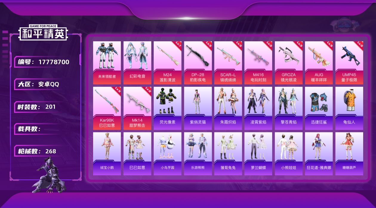 [17778700]安卓 手Q-3粉装-11特效枪-0载具-1粉色飞行器-80912热力值-14王牌印记-201套装-268枪皮
