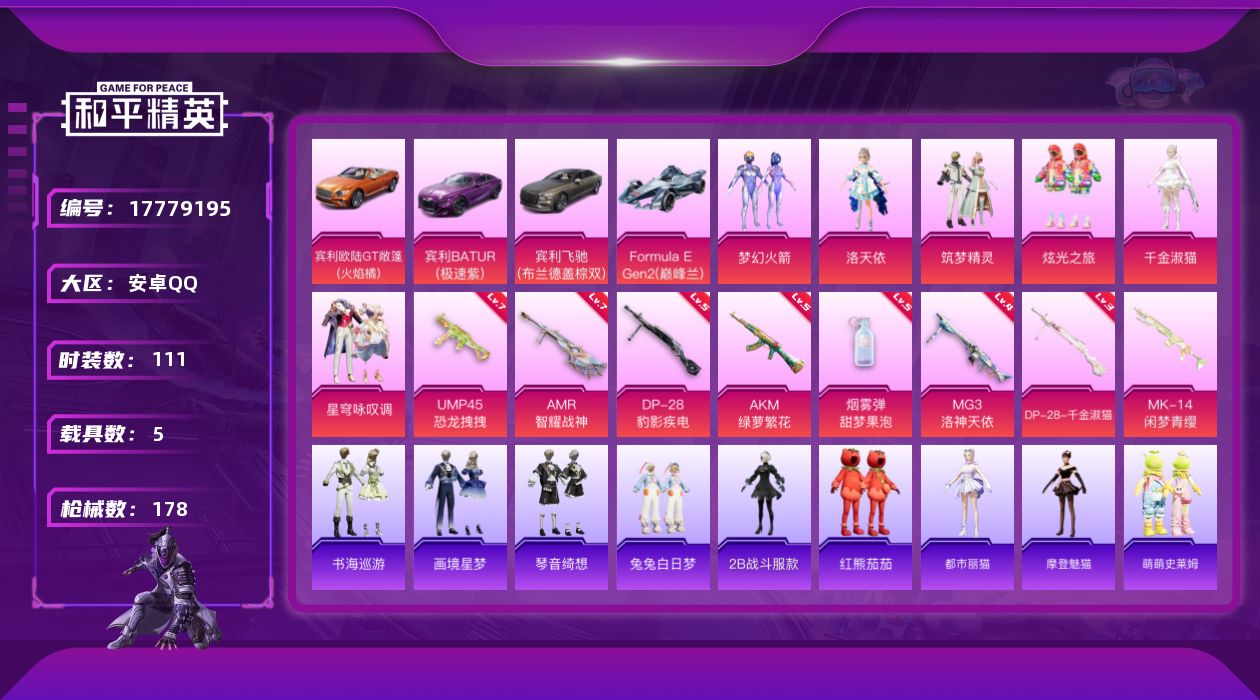 [17779195]【特价出售/店主推荐】安卓 手Q-1神装-6粉装-10特效枪-5载具-4粉色飞行器-62434热力值-12王牌印记-111套装-178枪皮【红色神装等级】:暮色玫影-艾丽娅(一级)【红色角色神装】:暮色玫影-艾丽娅【热门品类】:粉装-梦幻火箭,角色-2B战斗服款,套装-红熊茄茄【粉色套装】:粉装-梦幻火箭,角色-洛天依,粉装-筑梦精灵,粉装-炫光之旅,角色-千金淑猫,粉装-星穹咏叹调【粉色枪皮等级】:AKM-绿萝繁花(五级),AKM-暮色玫影(三级),UMP45-恐龙拽拽(七级),AKS-74U-森灵之息(五级),AMR-智耀战神(七级),DP-28-千金淑猫(三级),DP-28-豹影疾电(五级),MG3-洛神天依(四级),烟雾弹-甜梦果泡(五级)【粉色载具】:宾利欧陆GT敞篷(火焰橘),宾利BATUR(极速紫),宾利飞驰(布罗德盖棕双色),Formula E Gen2(巅峰兰),暮色幽蹄【粉色枪皮】:AKM-绿萝繁花,AKM-暮色玫影,UMP45-恐龙拽拽,AKS-74U-森灵之息,Mk14-闲梦青缨,AMR-智耀战神,DP-28-千金淑猫,DP-28-豹影疾电,MG3-洛神天依,烟雾弹-甜梦果泡【粉色飞行器】:梦幻火箭飞行器,沙丘之主天马,雀灵庇佑飞行器,暮色之舞飞行器
