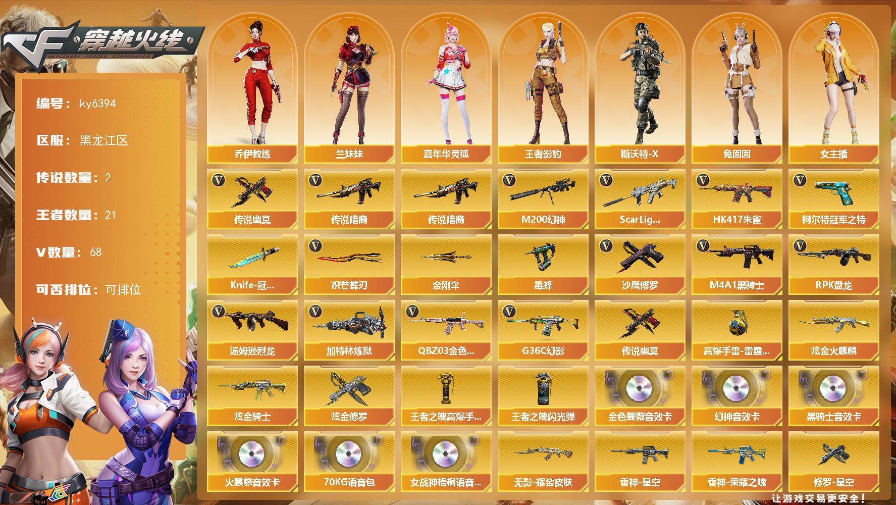 [17779286]【ky6394】黑龙江区-87V-21王者武器数-5炫金武器数 【传说武器】:传说暗裔,传说幽冥 【传说角色】:传说影煞 【热门武器】:传说暗裔,传说幽冥,G36C-幻影,QBZ03-金色蔷薇,Scar Light-白虎,HK417-朱雀,M200-幻神,柯尔特-冠军之特,毒蜂,M4A1-黑骑士,汤姆逊-烈龙*5,RPK-盘龙*5,加特林-炼狱,沙鹰-修罗*3,Knife-冠军之刃,炽芒蝶刃,金刚伞 【王者炫金武器】:王者之魄高爆手雷*3,王者之魄闪光弹,高爆手雷-雷霆王者,炫金火麒麟,炫金骑士,炫金修罗*3 【音效卡】:M200-幻神音效卡,AK47-火麒麟音效卡,M4A1-黑骑士音效卡,QBZ03-金色蔷薇音效卡,70KG语音包,女战神梧桐语音包 【皮肤】:幻神-巅峰荣耀,白虎-霓虹机甲 皮肤,白虎-虎啸皮肤,雷神-荣耀之魄,雷神-星空,M4A1-雷神-CFS 2019,雷神-虎将,火麒麟-华夏之心,火麒麟-平天大圣,火麒麟-盘古,火麒麟-心动糖果,毁灭-冠军之怒,毁灭-黑大圣皮肤,毁灭-风暴,毁灭-直播专属,毁灭-英雄计划 皮肤,M4A1-千变-孔明皮肤,黑骑士-冠军之势,黑骑士-伏羲,无影耀金皮肤,无影-神兵利器 皮肤,修罗-星空 【角色】:葵,炫,雨棠,荒漠琉璃,王者-瞳-闭月羞花,王者影豹,王者沙漠玫瑰,乔伊教练,修道士,暗夜-X,风暴女,嘉年华灵狐,卡塔琳娜,兰-海滩派对,兰妹妹,灵动武士,灵狐者-职业经理,曼陀罗-X,曼陀罗-礼服,女主播,潘多拉-X,潘多拉-甜心教官,斯沃特-X,蜀雪,兔囡囡,影武者-X 【人偶武器】:迷你宝贝,巴雷特-零-水下丽影,AWM-灵狐-15周年嘉年华,COP-旗袍,黄金迷你深渊冰龙,生化手雷-机甲核心,灵狐娃娃手雷 【暴走生化】:毒蜂,黑龙吞噬者,超级对讲机 【挑战大师】:火狱乱世-超越Max,神圣爆裂者III,冰龙粉碎者-白马银枪,激光毁灭者III-白马银枪*2,试炼破坏者III,KAC-圣炎切割者III 【英雄级武器】:M4A1-千变,AK47-火麒麟*2,M4A1-雷神,M4A1-黑骑士,AK47-无影,M4A1-死神,AK12-天启,AN94-超新星,AK47-机械迷城,AK47-黑鲨,HK417-朱雀,Scar Light-白虎,QBZ03-天罚,无影-神兵利器,G36C-幻影,黑武士-锦绣游龙,QBZ03-