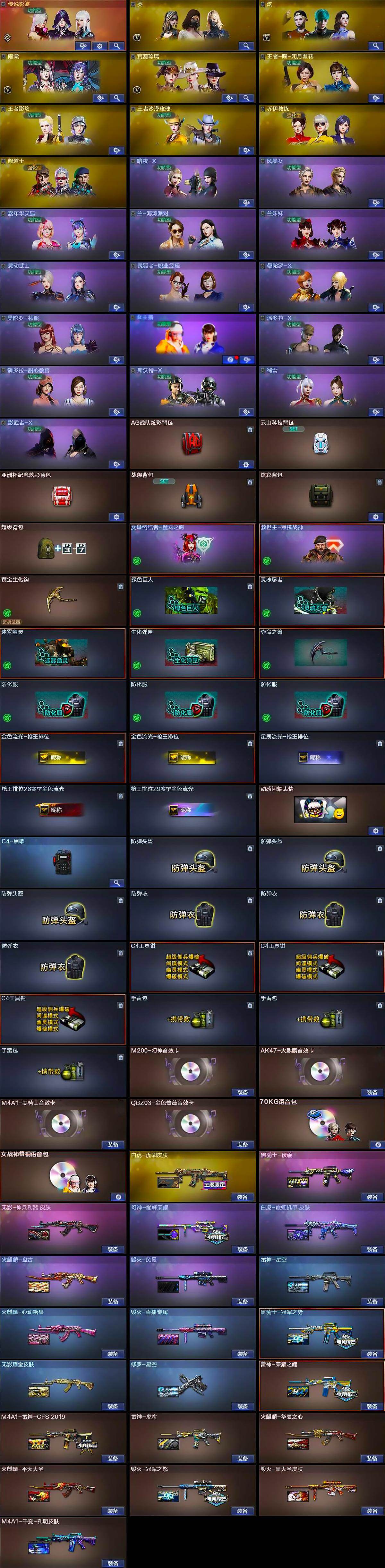 - [16060483]山东一区-40V-0王者-0炫金 【热门武器】:M200-竞技荣光,死亡之眼,白虎-电玩蓝兔,USP-雷暴,沙鹰-修罗 【音效卡】:Barrett-碧霄极光音效卡*2,炼狱-百战金芒-庆典舞曲音效卡,沙鹰-修罗-盛典舞曲音效卡,AWM-昌龙-怀旧音效卡 【皮肤】:雷神-暗月,雷神-R.LGD-CFPLS18冠军,雷神-机甲刑天皮肤,M4A1-再燃火线,火麒麟-雷神,火麒麟-平天大圣,火麒麟-心动糖果,毁灭-暗月,毁灭耀金皮肤,毁灭-黑大圣皮肤,黑骑士-暗月*2,战神-粉色甜心皮肤,战神-流金岁月皮肤,修罗-百战金芒 皮肤,轻型军用手斧-再燃火线 【角色】:电竞教官-云悠悠,战地猎狐,乔伊教练,暗夜-X,初恋灵狐,芳心审判者,风暴女*2,虎妞,嘉年华灵狐,灵狐-花神,灵狐者-X,麻雀,曼陀罗-X,潘多拉-X,蛇姬,斯沃特-X,蜀雪,兔囡囡,维纳斯,樱-战斗天使 【人偶武器】:火麒麟-灵狐,AWM-灵狐-15周年嘉年华*2,海滩汪汪-巴雷特,迷你深渊冰龙,迷你波特博士*6,生化手雷-机甲核心,迷你超能女侍 【暴走生化】:死亡之眼,超级对讲机 【挑战大师】:冰龙粉碎者-白马银枪,激光毁灭者III-白马银枪*2,试炼破坏者III 【英雄级武器】:AK47-火麒麟*2,M4A1-雷神,无影-神兵利器,M4A1-玫瑰精灵,AK-47-猩红传说*2,AK47-B-战神,黑骑士-海王,白虎-电玩蓝兔,Barrett-毁灭,Barrett-朱雀,M200-竞技荣光,炼狱-百战金芒,沙鹰-修罗,USP-雷暴,柯尔特-竞技荣光,屠龙,擎天-竞技荣光,麒麟刺-百战金芒,高爆手雷-竞技荣光*5,闪光弹-竞技荣光*5,烟雾弹-竞技荣光*4,M4A1-赤狱骑士,Barrett-碧霄极光 【道具】:BS战队炫彩背包,CFS限定背包,R.LGD炫彩背包,XROCK炫彩背包,云山科技背包,亚洲杯纪念炫彩背包,炫彩背包-诺拉,百战金芒炫彩背包,背包-洛丽塔,虎牙炫彩背包,超级背包,女皇终结者-魔龙之吻,救世主-黑桃战神,绿色巨人,灵魂忍者*3,变异宝贝,妖姬,迷雾幽灵*2,夺命之镰,防化服*3,金色流光-枪王排位,流光-鎏金之域,流光-再燃火线,枪王排位29赛季金色流光,语音特效-盛典烟火,萌萌小葵表情,电玩兔兔表情,C4-再燃火线,防弹头盔*9,防弹衣*9,C4工具钳*9,手雷包*9 【特殊枪械】: