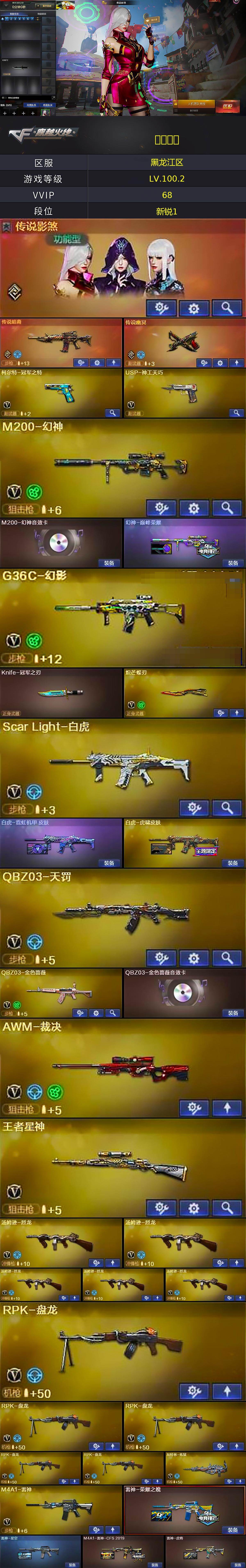 【热门武器】:传说暗裔,传说幽冥,G36C-幻影,QBZ03-金色蔷薇,Scar Light-白虎,HK417-朱雀,M200-幻神,柯尔特-冠军之特,毒蜂,M4A1-黑骑士,汤姆逊-烈龙*5,RPK-盘龙*5,加特林-炼狱,沙鹰-修罗*3,Knife-冠军之刃,炽芒蝶刃,金刚伞