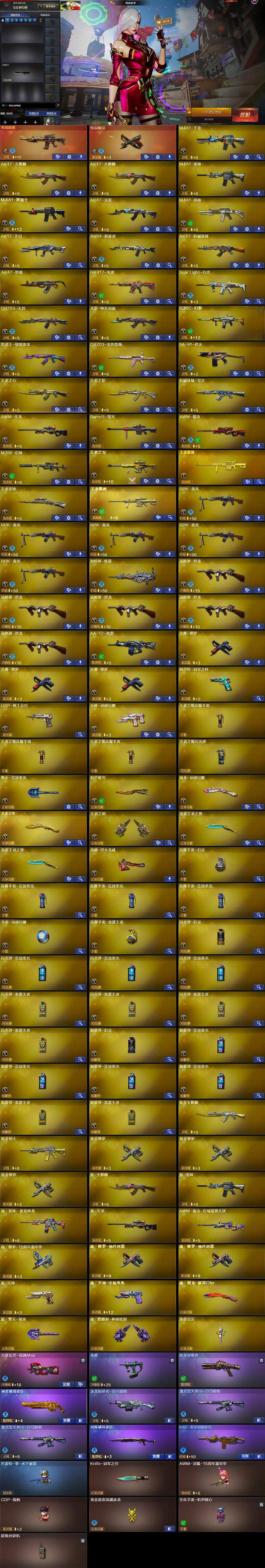【英雄级武器】:M4A1-千变,AK47-火麒麟*2,M4A1-雷神,M4A1-黑骑士,AK47-无影,M4A1-死神,AK12-天启,AN94-超新星,AK47-机械迷城,AK47-黑鲨,HK417-朱雀,Scar Light-白虎,QBZ03-天罚,无影-神兵利器,G36C-幻影,黑武士-锦绣游龙,QBZ03-