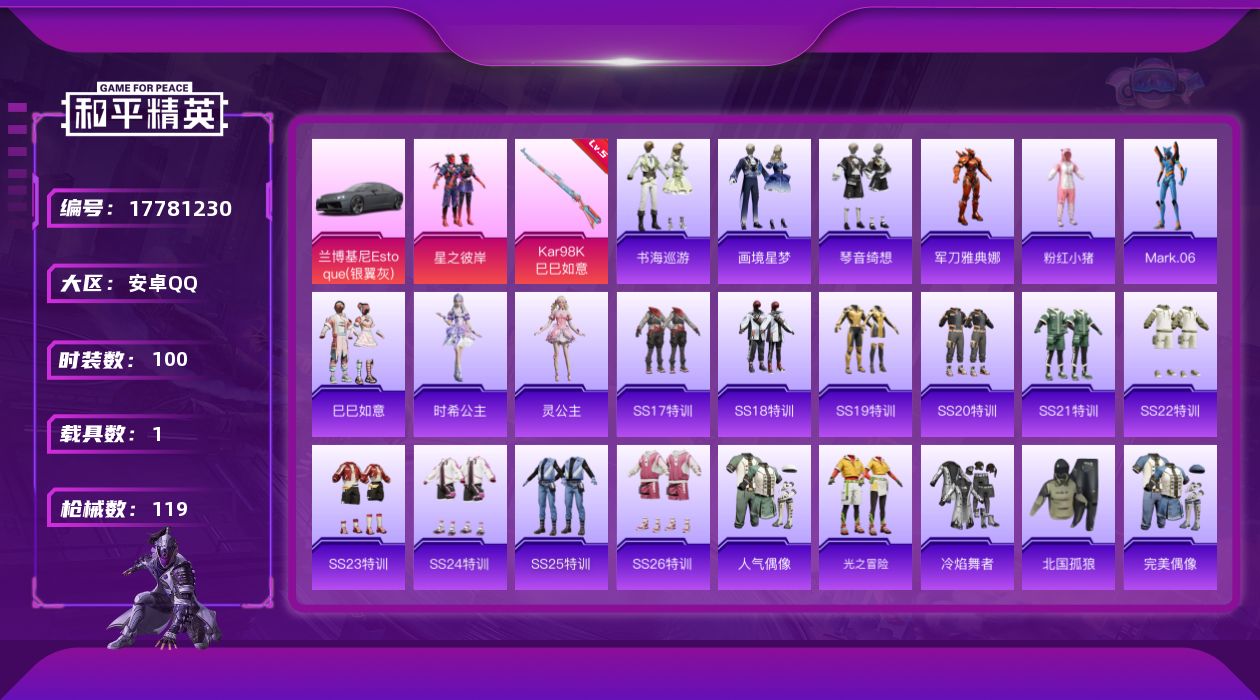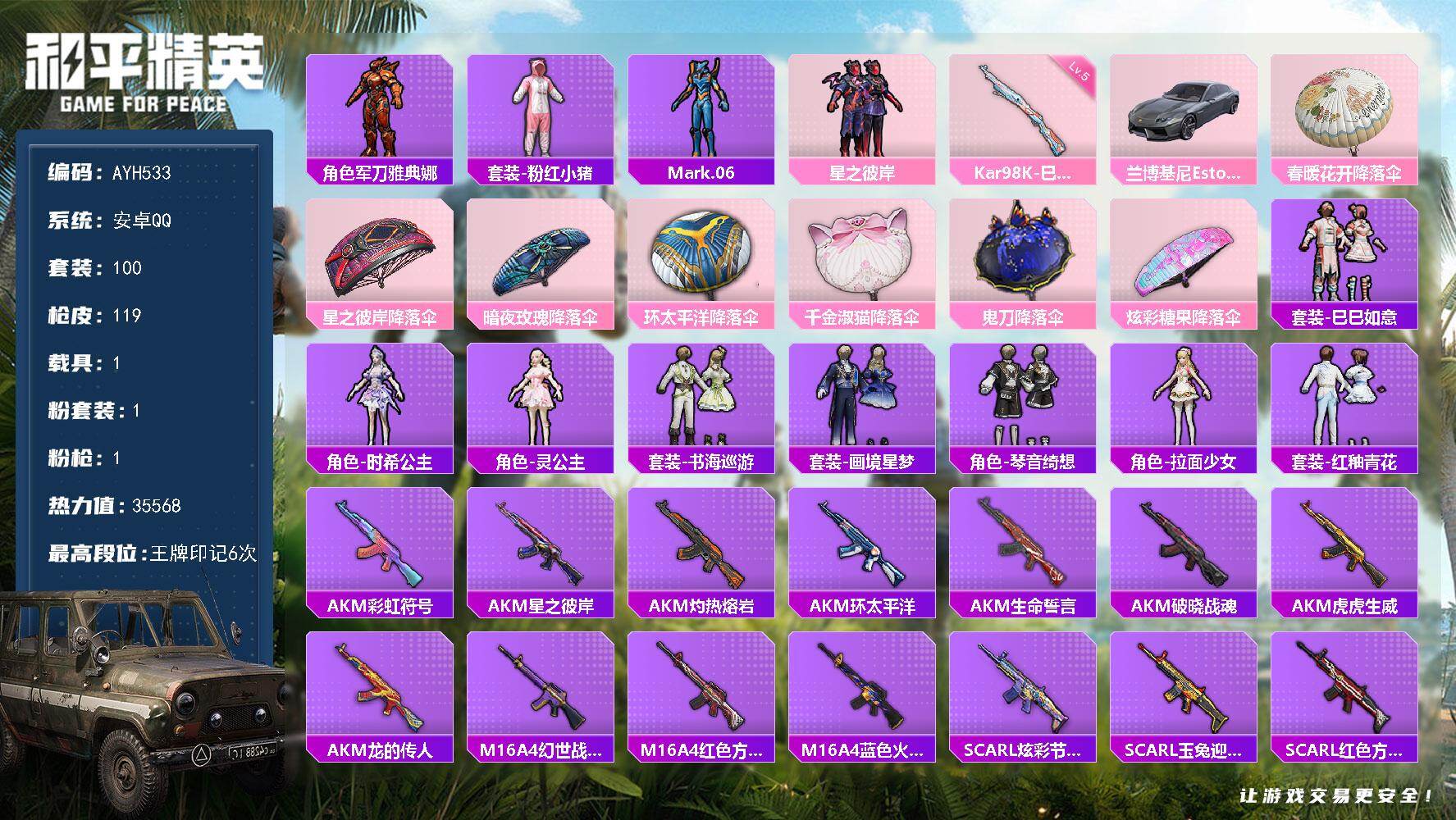 [17781230]安卓 手Q-1粉装-1特效枪-1载具-0粉色飞行器-35568热力值-6王牌印记-100套装-119枪皮【热门品类】:角色-军刀雅典娜,套装-粉红小猪,角色-Mark.06【粉色套装】:粉装-星之彼岸【粉色枪皮等级】:Kar98K-巳巳如意(五级)【粉色载具】:兰博基尼Estoque(银翼灰)【粉色枪皮】:Kar98K-巳巳如意